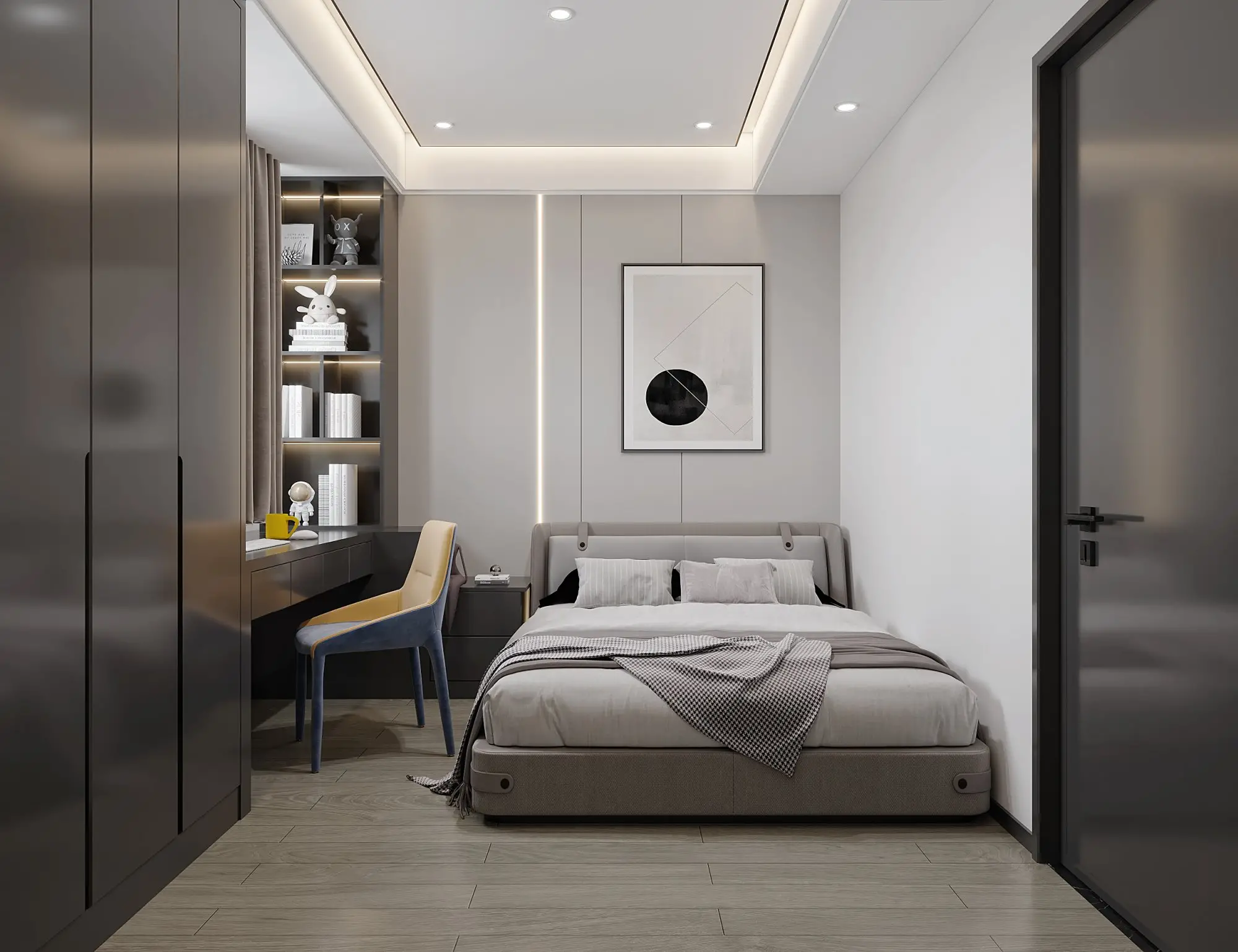 客卧的空间做的定制的柜子与书桌的拼接设计,一张柔软的灰色调双人床,搭配着一侧的灯带设计,增加空间的层次感。