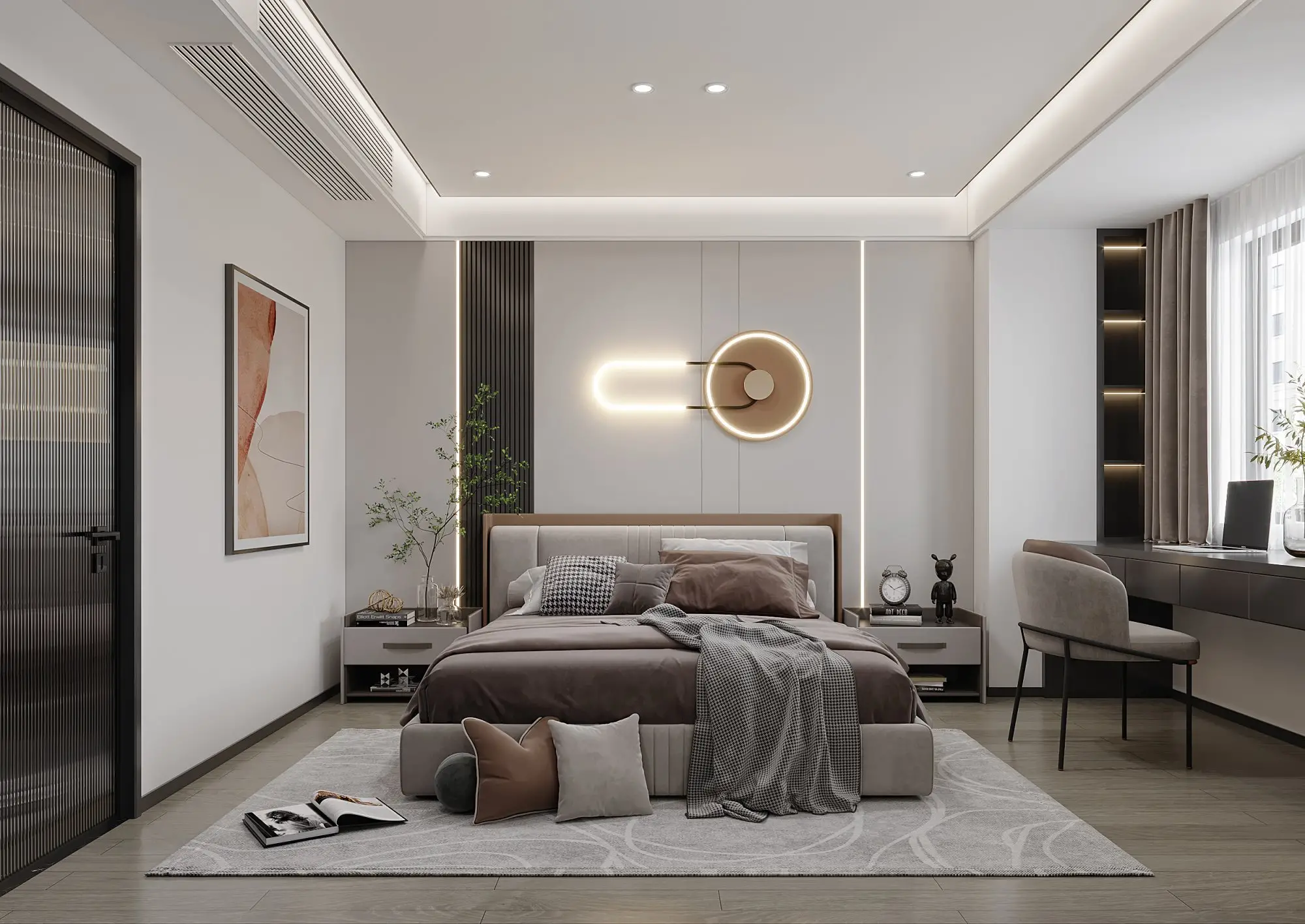 主卧的空间中,一张柔软的双人床搭配着两侧的灯带,增加空间的层次感。在窗户处的位置,定制一方书桌,满足临时的办公需求。