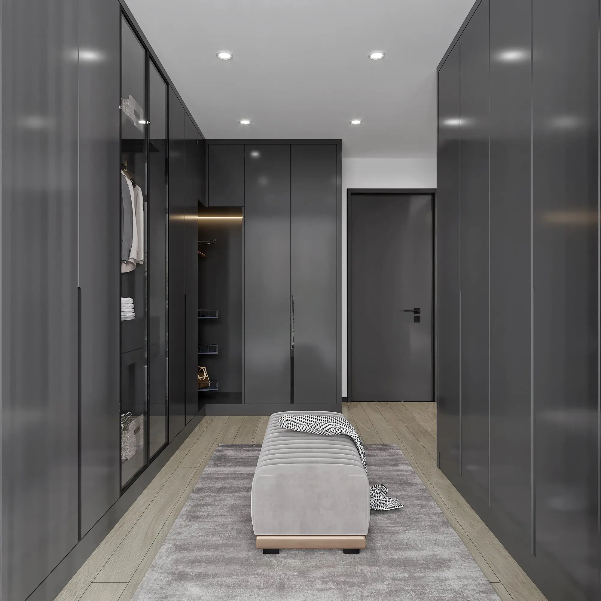 这是一个独立的衣帽间,定制的收纳柜可以满足一家人的储物需求,深灰色调的柜门与玻璃柜门相结合,营造出一个精致的空间氛围。