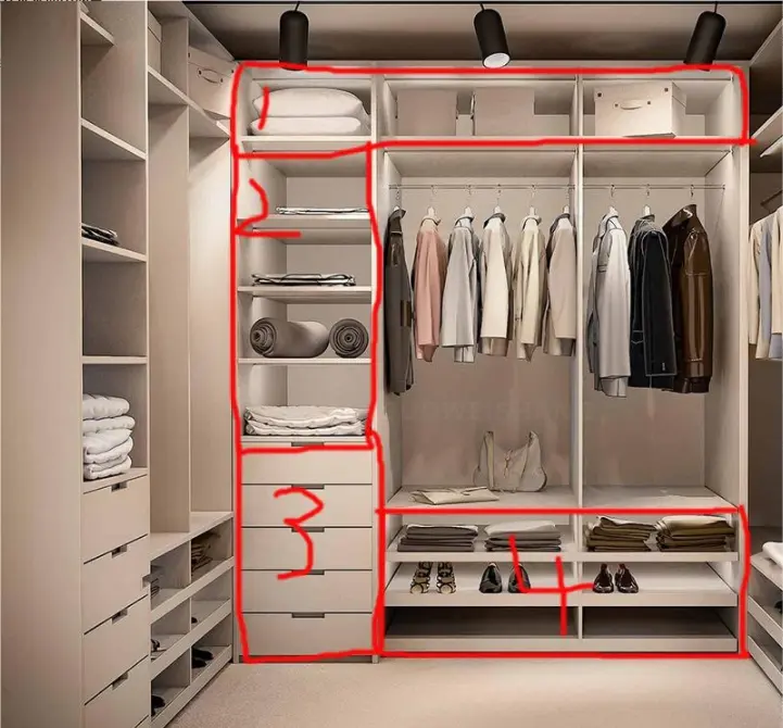 3号区域, 这种小柜子一般都是收纳一点小玩意,按理来说做一两个就够了,但图中却大方地做了5个抽屉,有经验的朋友都知道,在定制柜体的时候,柜子超过一定数量是要加钱的,所以这么多柜子实在是没必要。