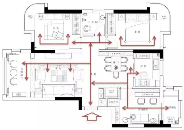 家务动线、居住动线、访客动线最好避免交叉,如果三条动线交叉在一起,会影响私密性和秩序性。