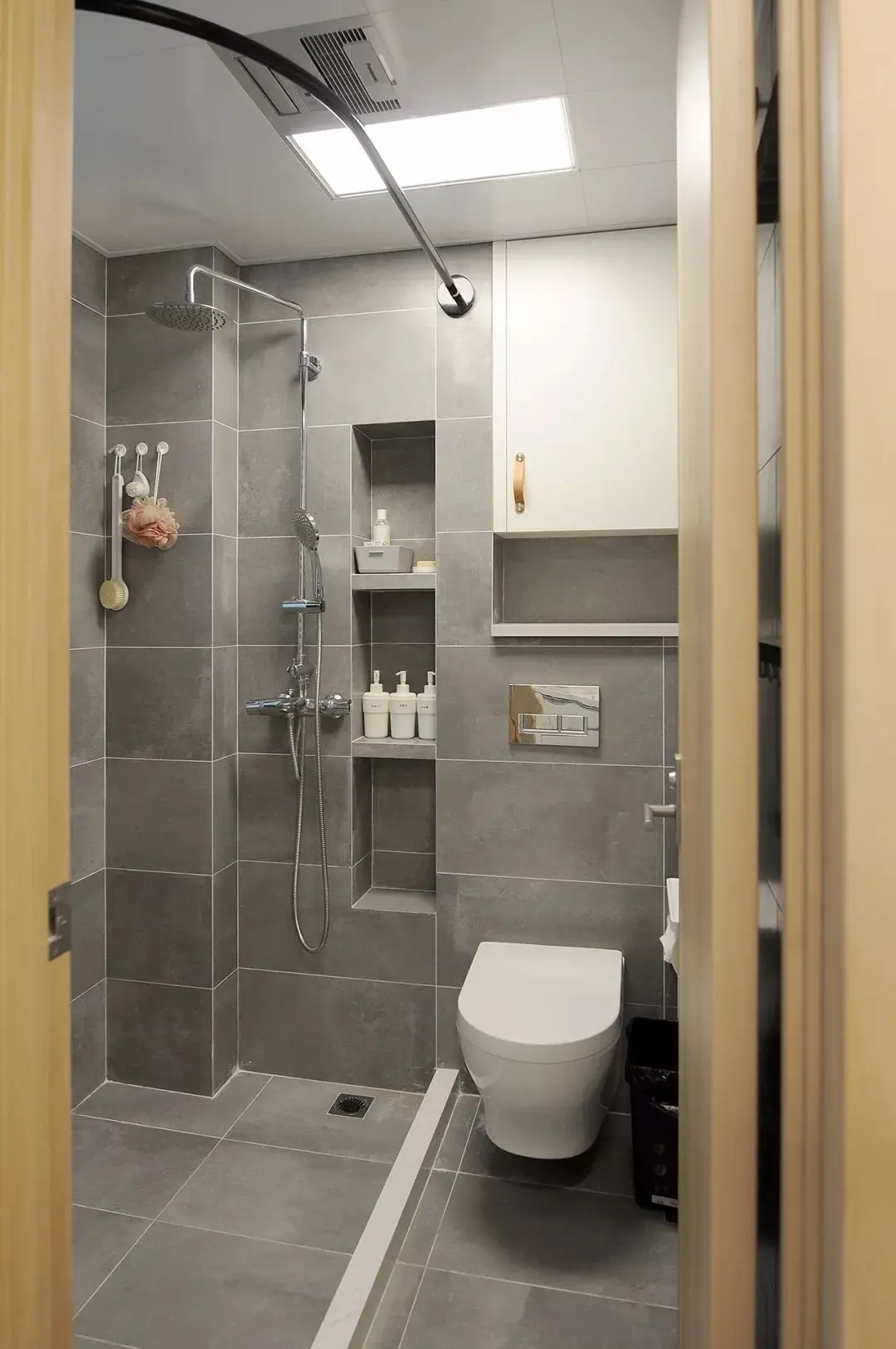 所以想要洗澡的时候地面不积水,或者将水更快排出,记得在装修的时候,将地面向地漏处做一个2%-3%的坡度,同理还有卫生间的壁龛,看似简单的小细节,却能提高我们的洗澡体验。