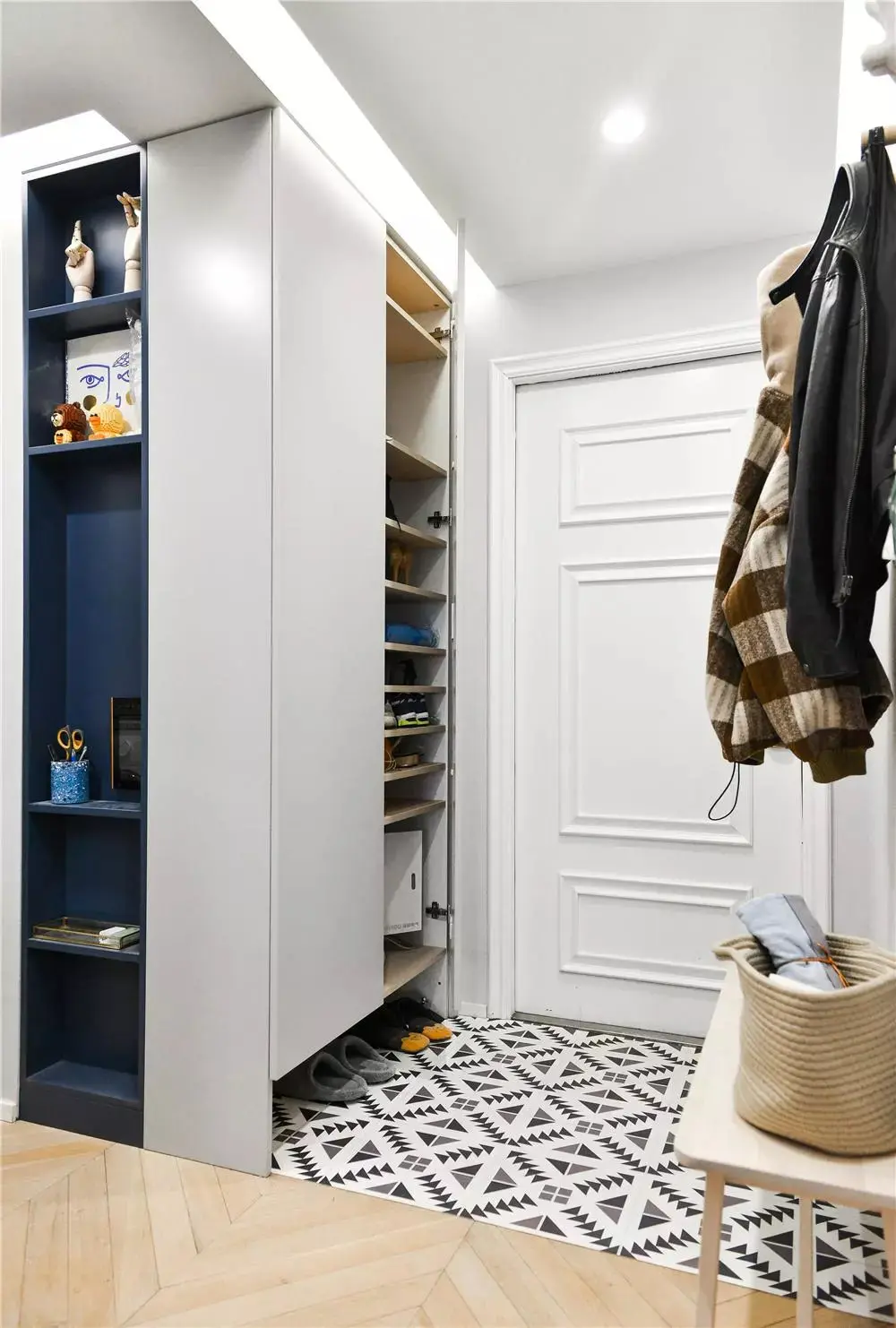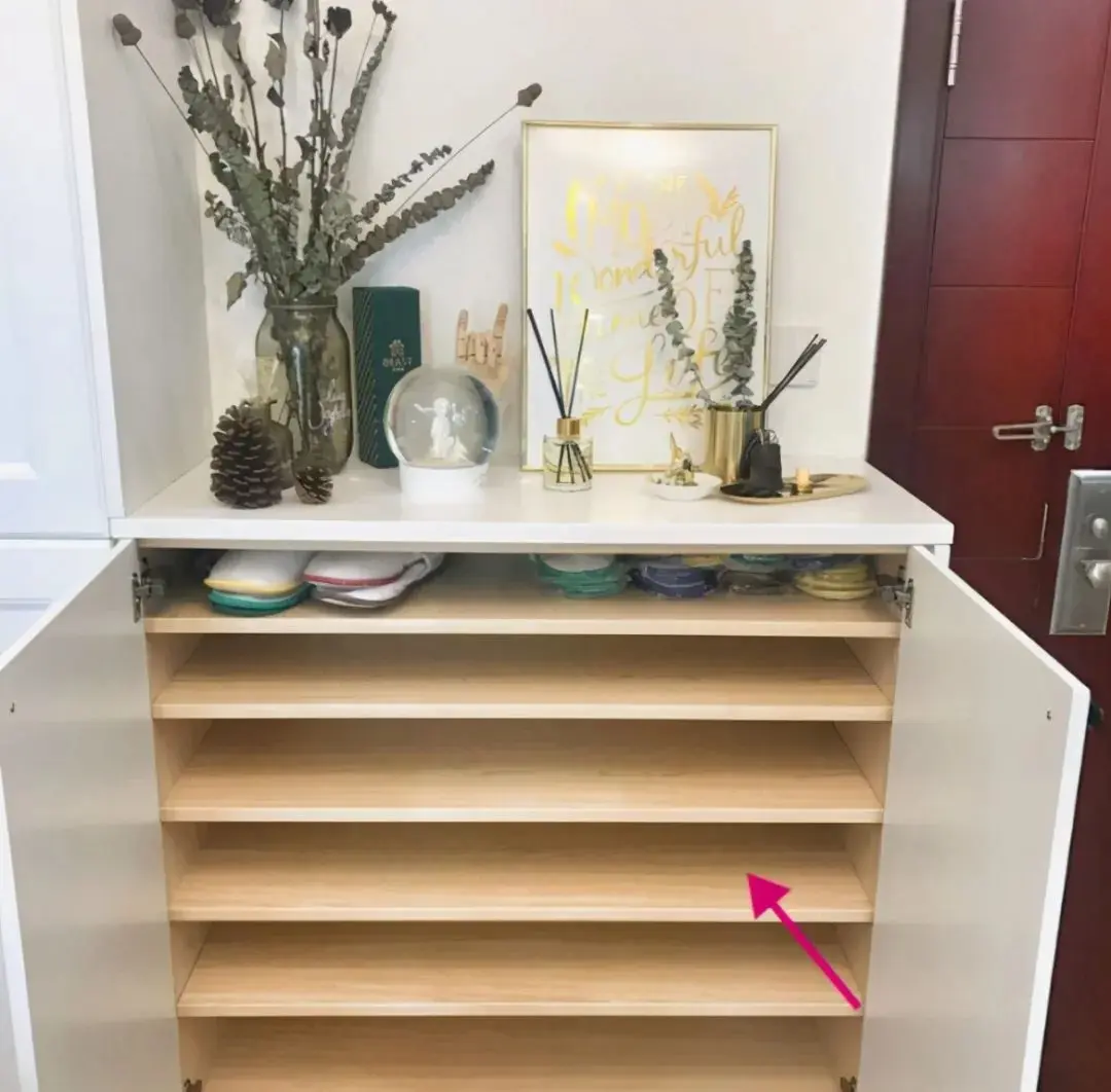所以在做玄关柜的时候,就应该把鞋柜做成活动层板,灵活定高低,更好地收纳鞋子。