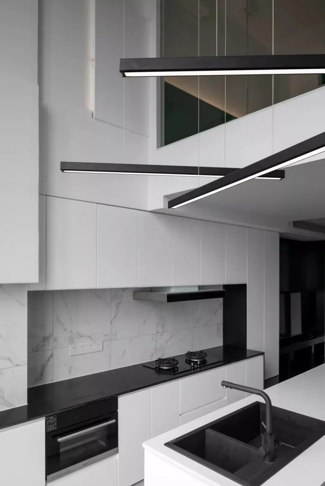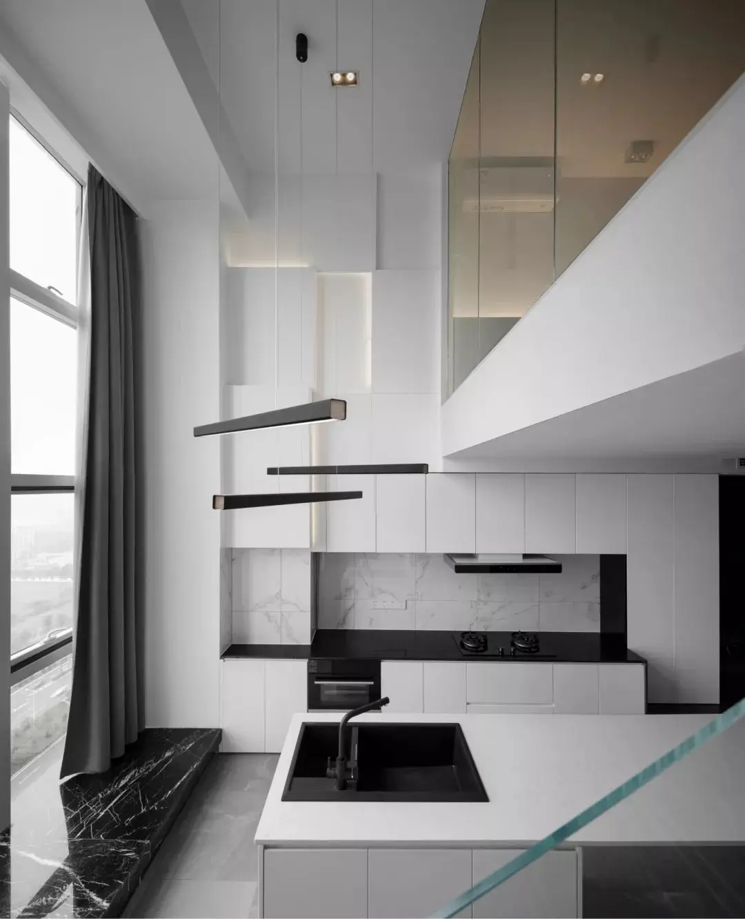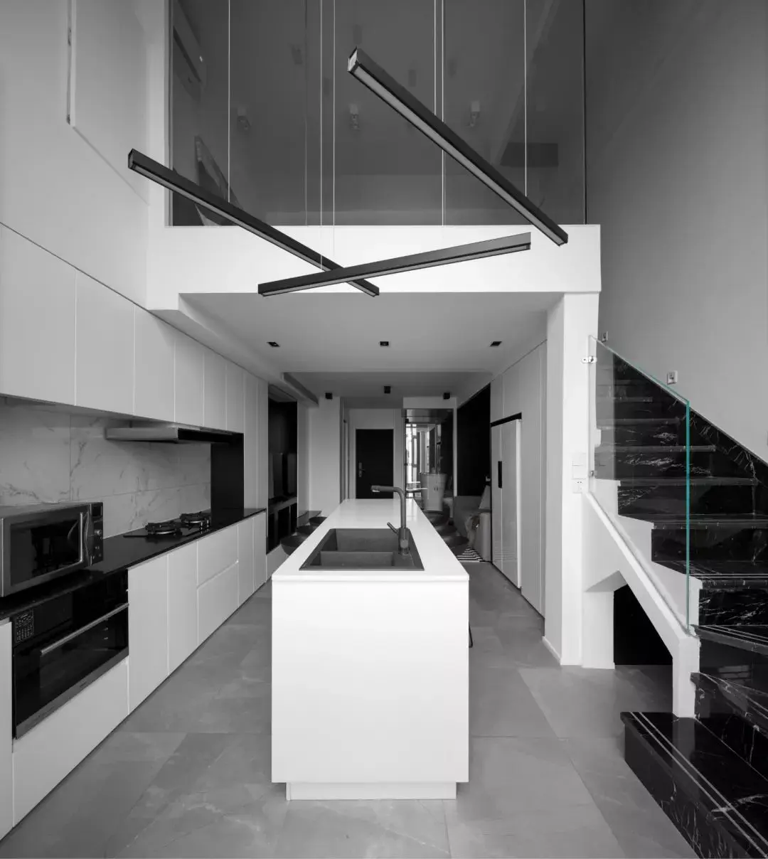 楼梯沿用了整体的极简风格,用黑白相间的瓷砖做踏步,透明的玻璃扶手也是为了增加通透性。