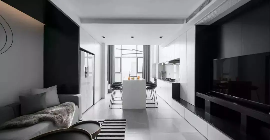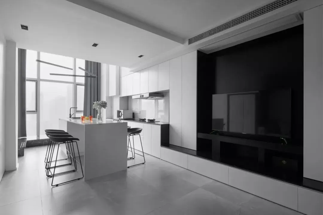 电视背景墙是一片纯净的黑色,没有做多余的装饰,搭配白色的一体化电视柜和橱柜。为了保持空间整洁,所有柜子都没装拉手,整体看上去也是高级感满满。