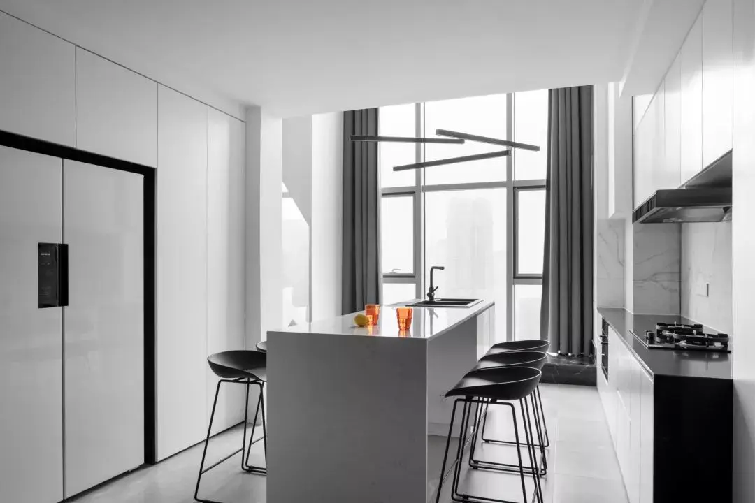 为了保障整个空间的通透性,功能区之间没有用隔断分离,采用黑白色的变化区分开各个区域,简单色彩+高整合度布局,让人第一眼就感觉宽敞大气。