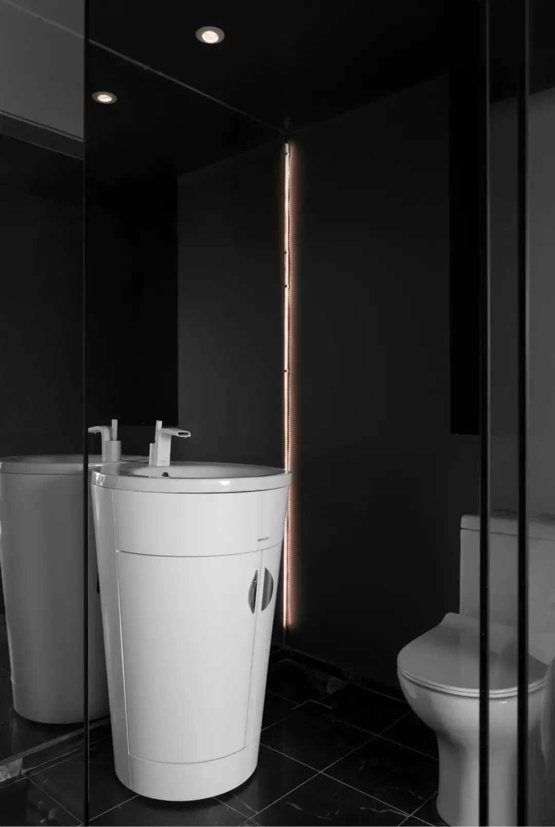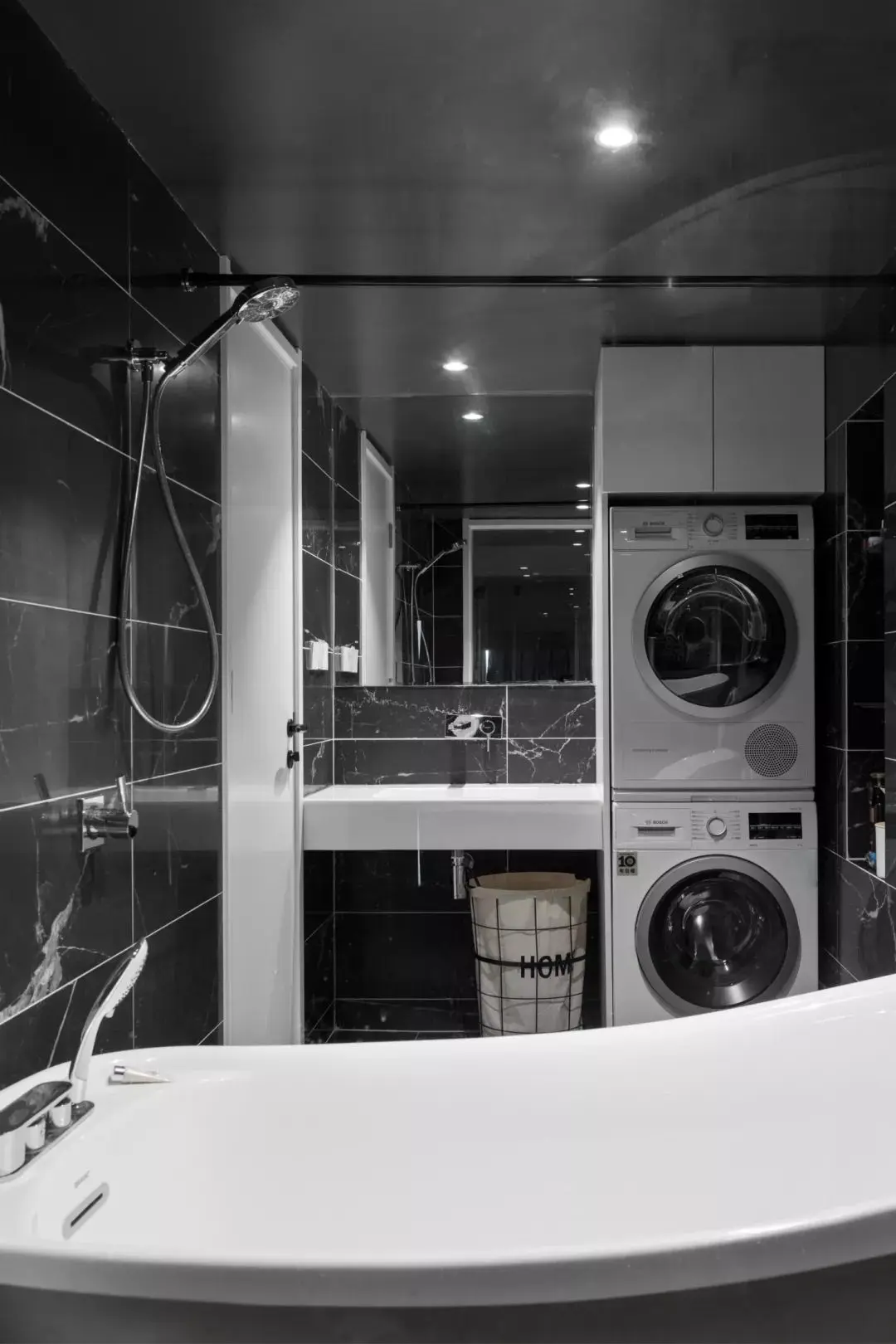 主卫选用整体台盆,脏衣篓和收纳盒可以直接放在下方,旁边是洗衣机和干衣机,精致单身贵族的居家必备良品。