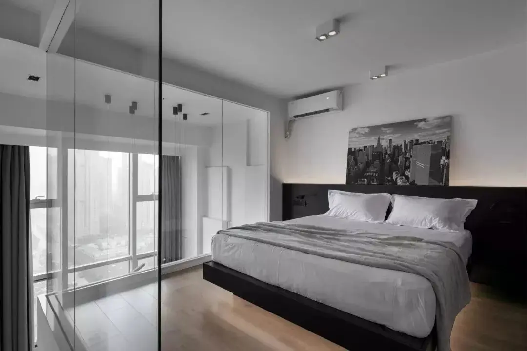 卧室部分为玻璃墙,提升卧室采光效果,黑白相间的背景墙富有层次感,床特别定制了靠背和床头柜一体的款式,这样整体的视觉效果更统一。上方摆放了一张装饰画来提升卧室的颜值。