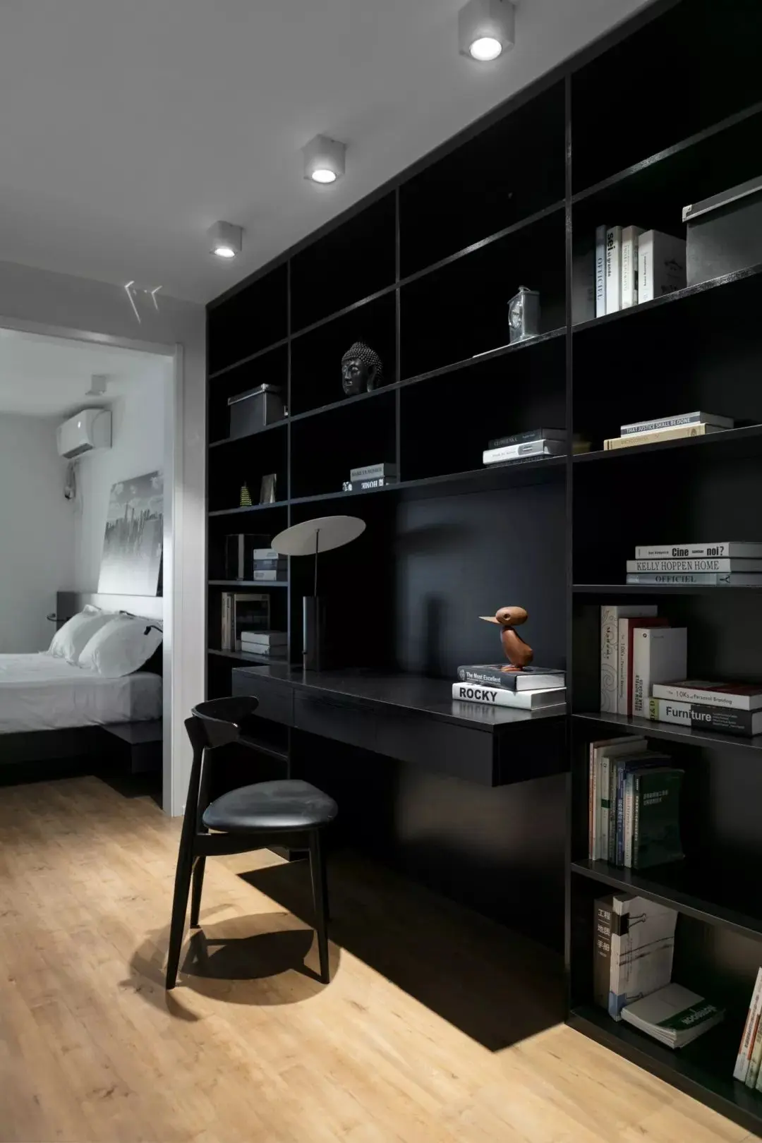 书房紧挨着卧室,通高的黑色书架大气十足,全开放式的书格方便拿取。