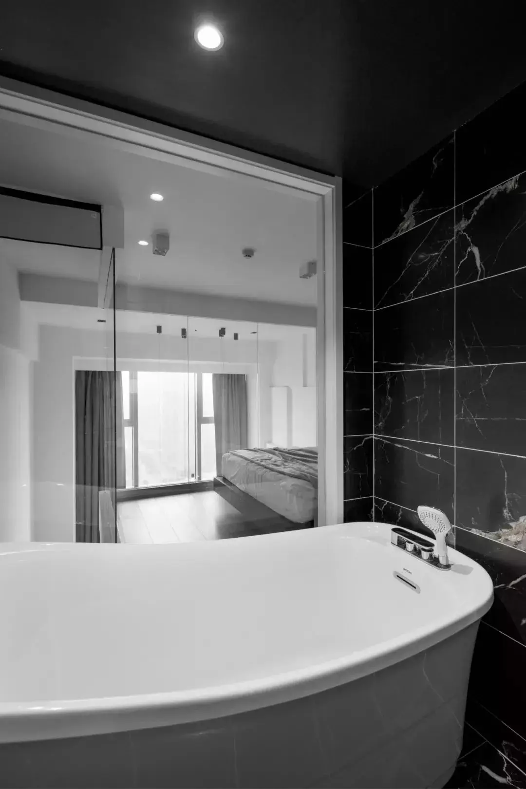 二楼属于私人空间,也不需要做过多的防护,大量采用玻璃墙隔断,保持了整个空间的通透感。躺在浴缸里,可以通过两层玻璃直接看到窗外的景色。