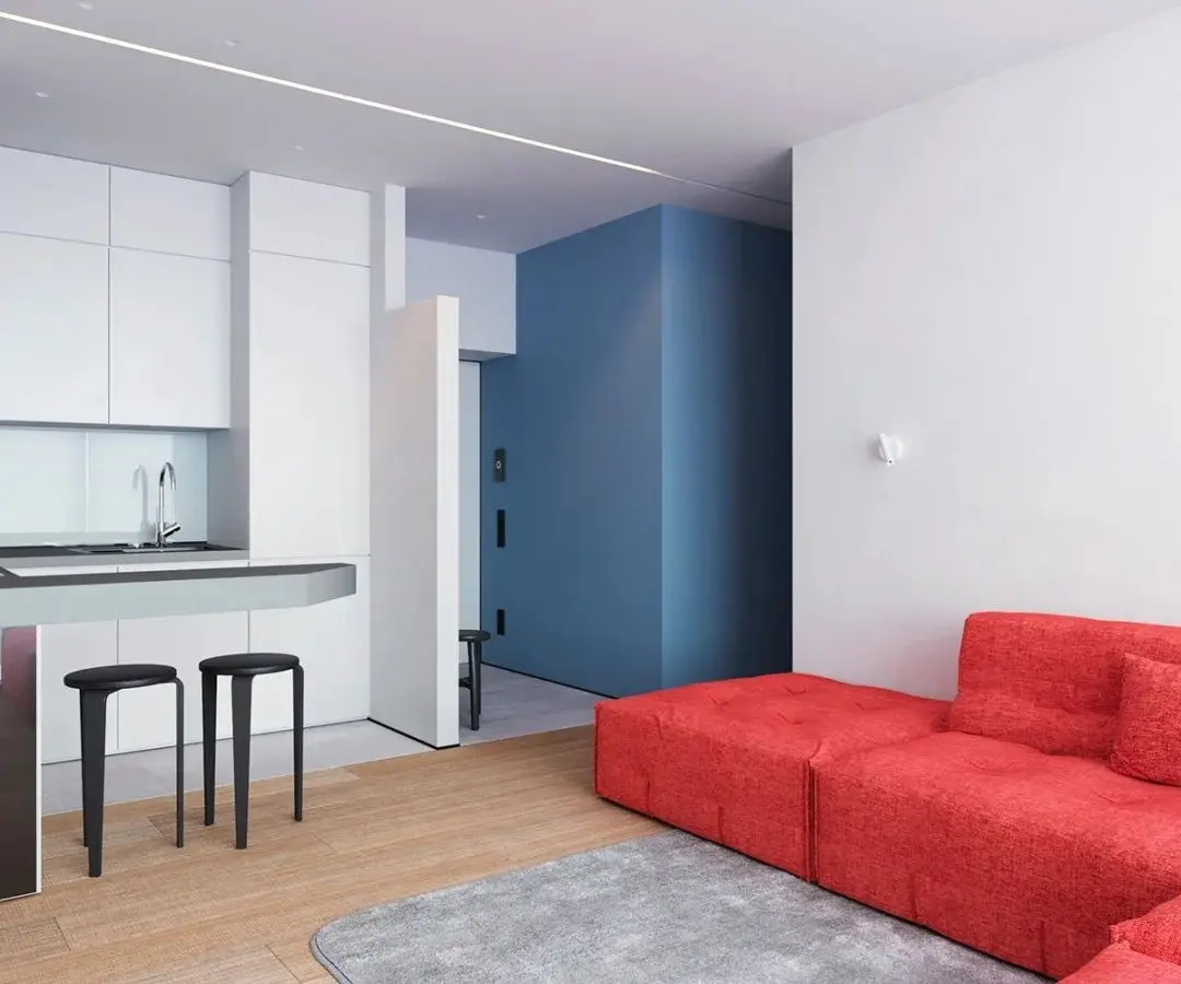 空间采用了明亮的红色和蓝色调色方案,用撞色手法突出表现了,即使是很小很有限的户型也能带来轻松的流动空间感。红蓝相间的内饰设计为极简空间增添轻松个性的氛围。