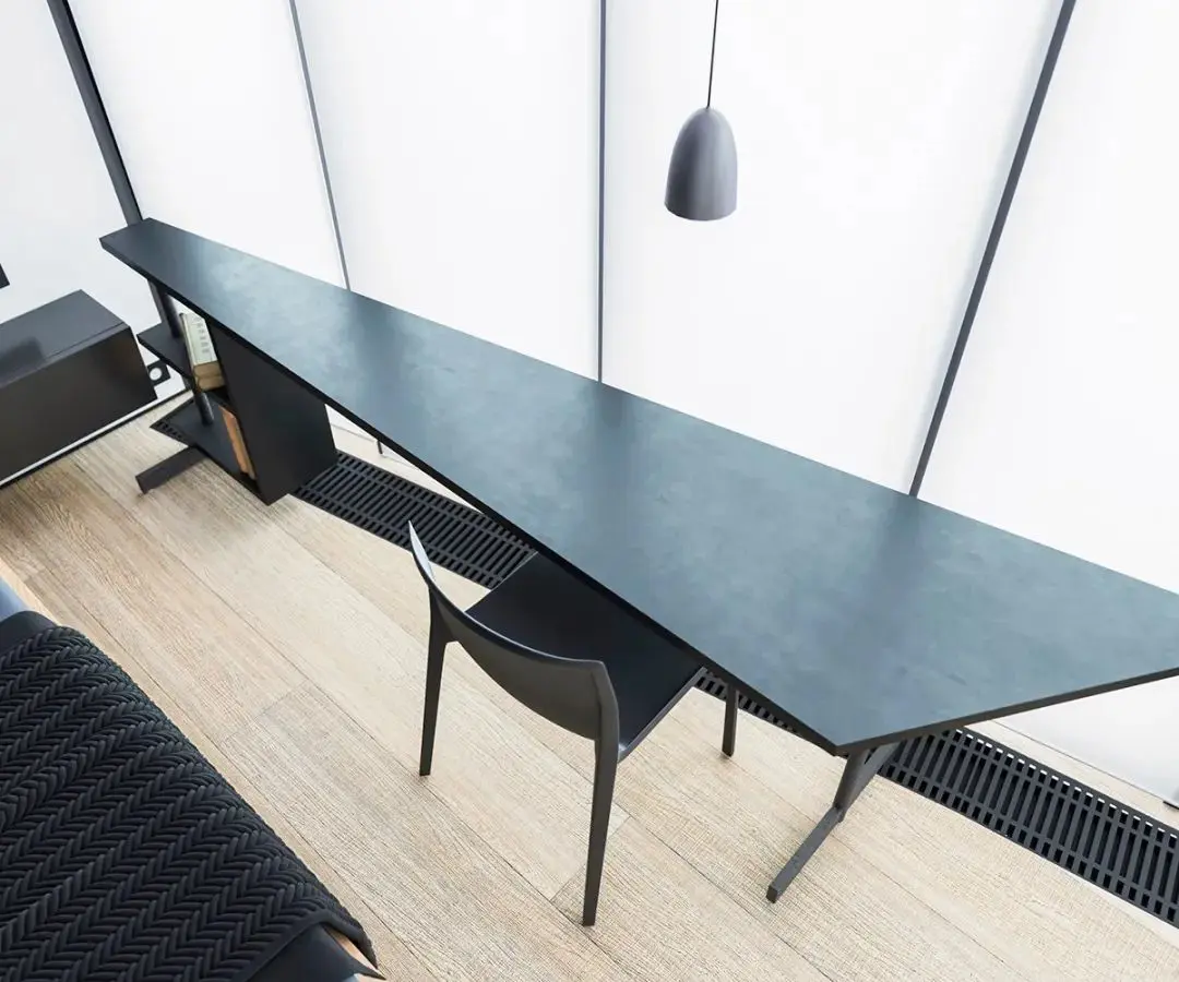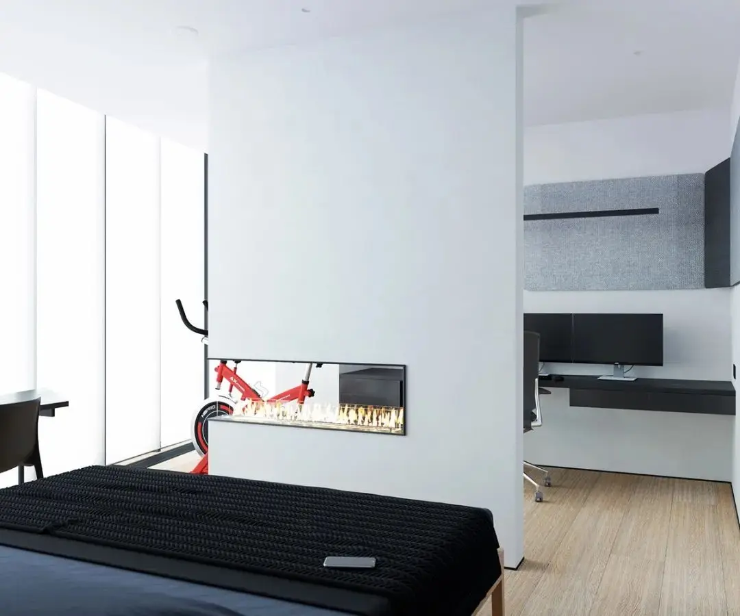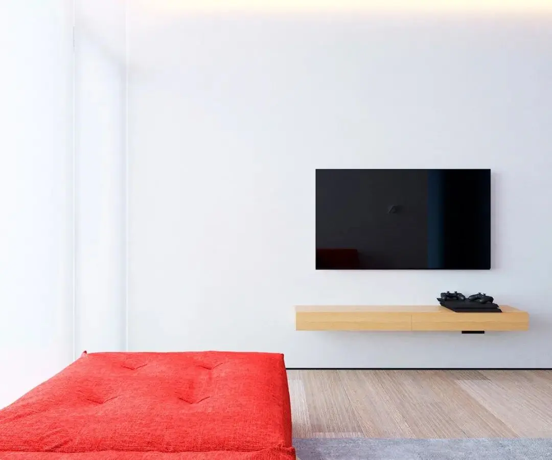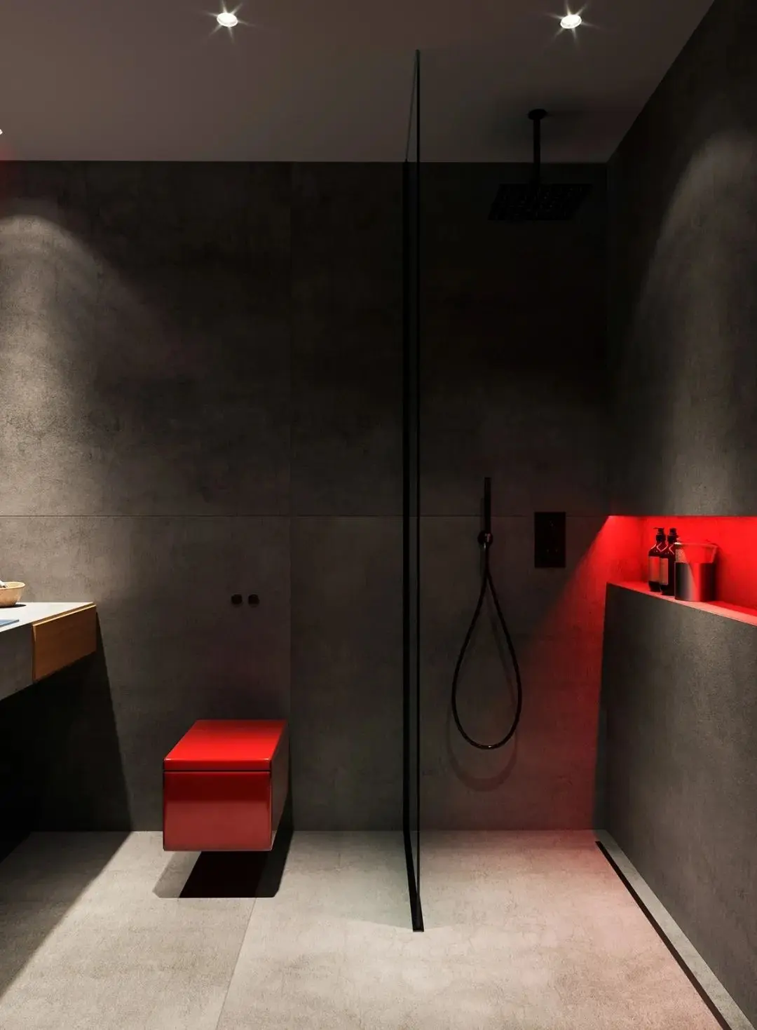 房主在居住空间上只保留了必需品,并将一个放松区、工作区和健身房组合成一个单独空间。红色沙发占据整个公共区域,搭配纯白色现代壁灯,以浅灰色地毯作为撞色间平衡介质。