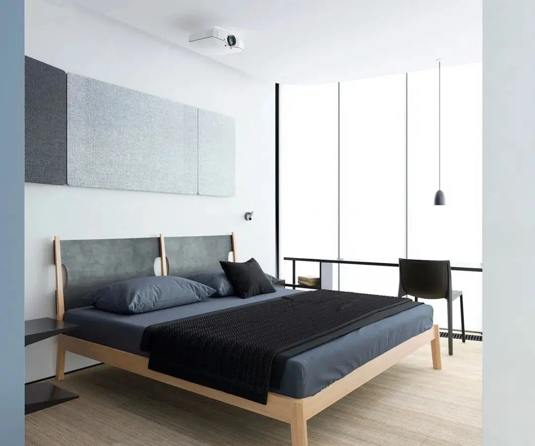 卧室作为休息空间以素朴质感为主,平静的中性灰和白色为主色调,黑色编织毯和丝绒抱枕给房间增色不少。
