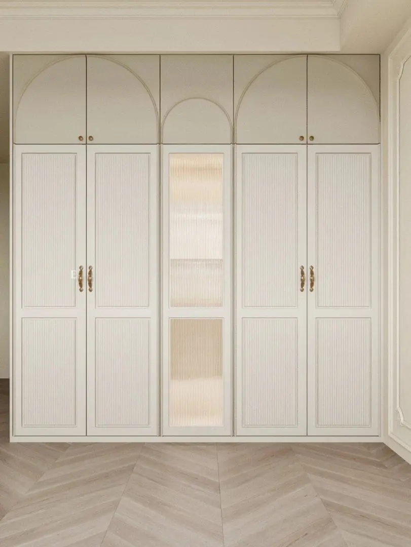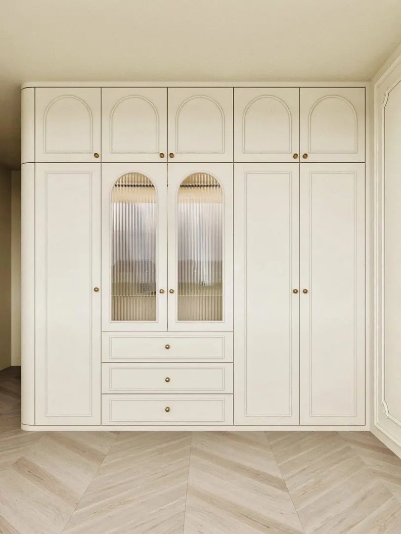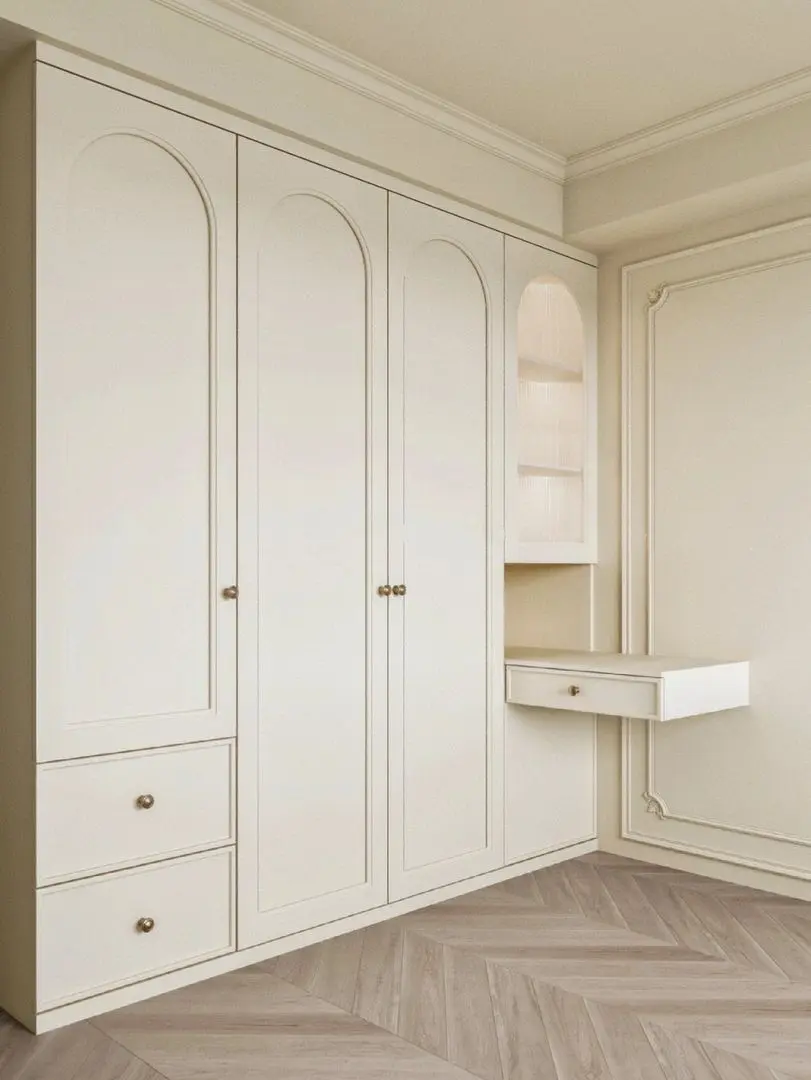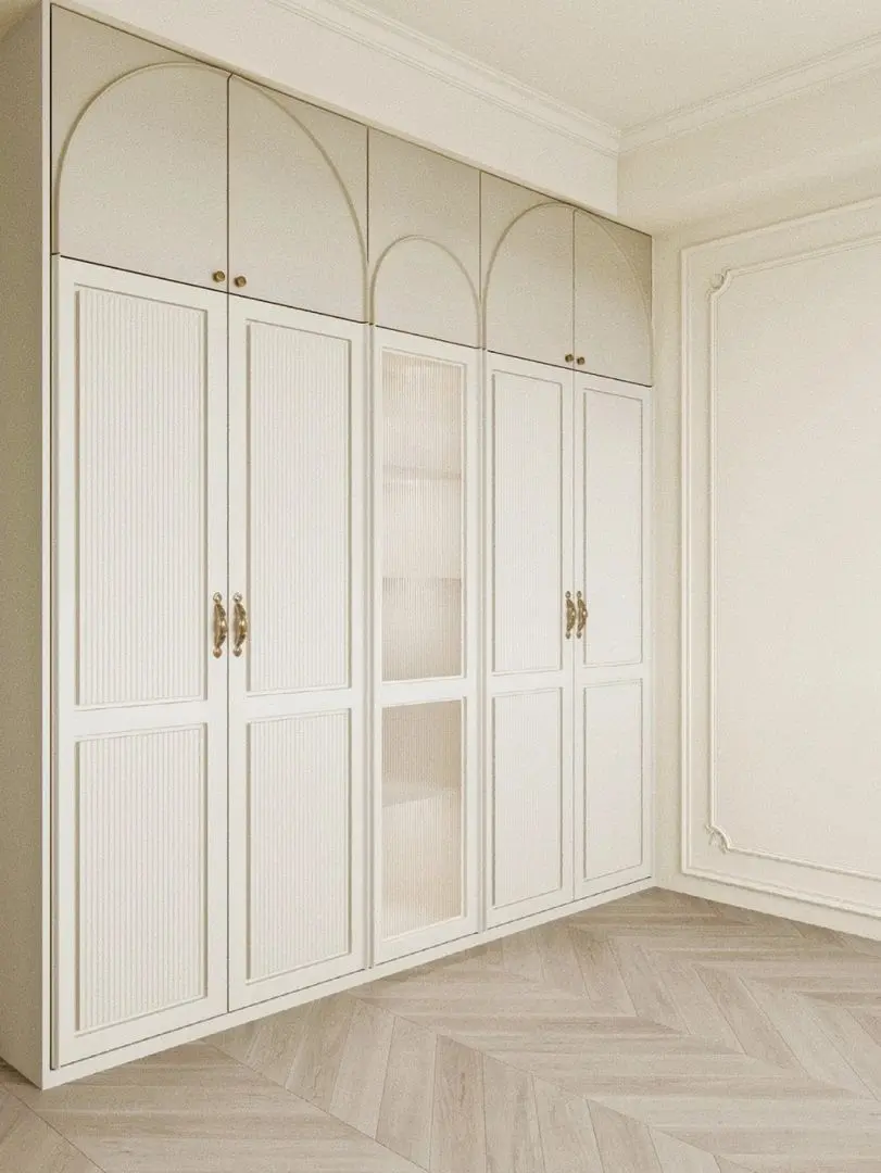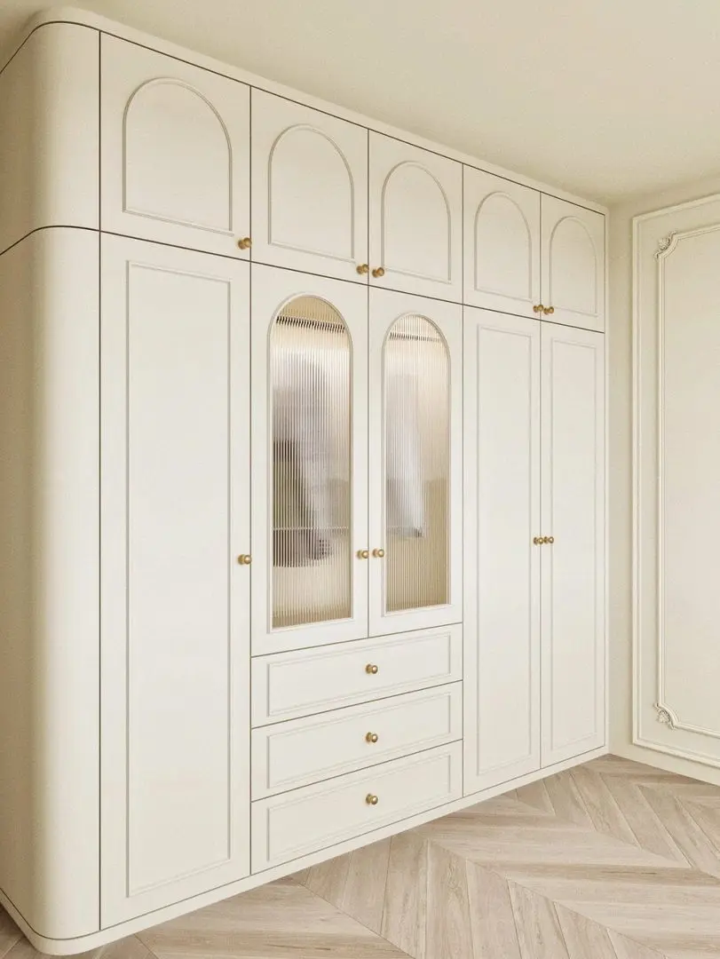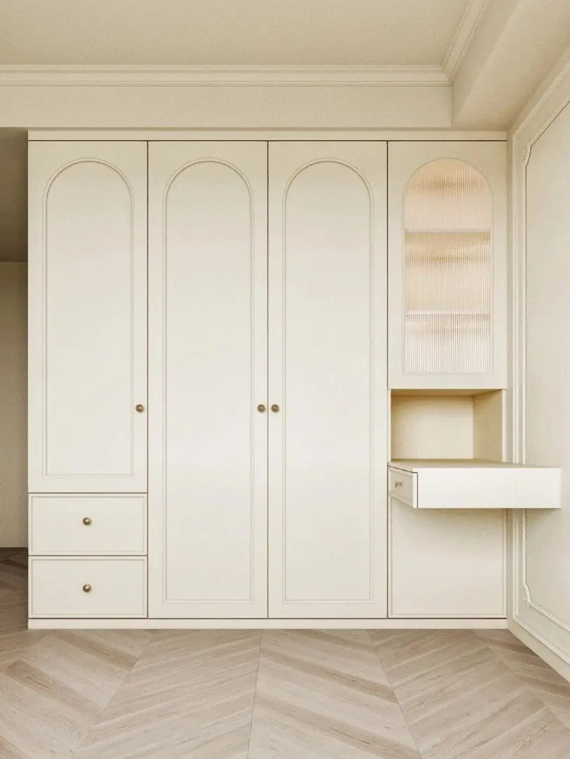 2⃣️第二款则是在衣柜的设计上增加了长虹玻璃门,提升空间的透气性和精致度,更值得一提的是,转角做了弧形包边,散发着温柔的气质呀~