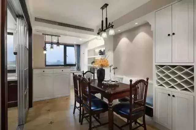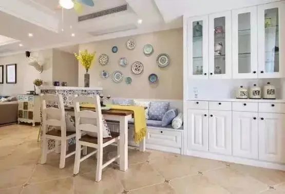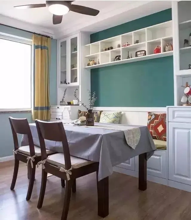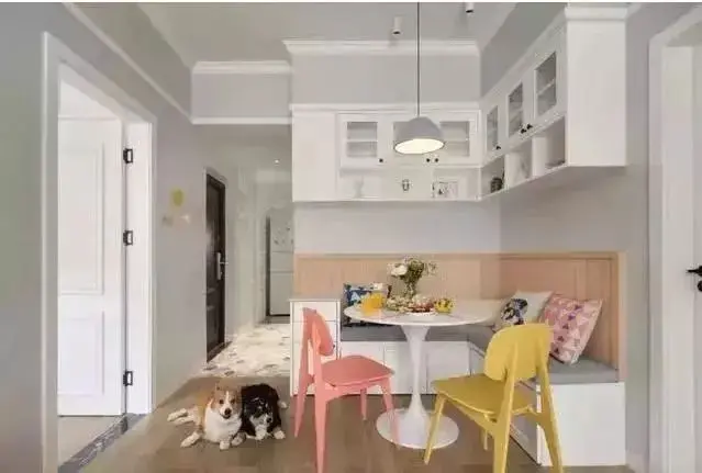 2、卡座:有些家庭户型小存储空间少,餐厅过道又窄,还在摆放餐桌和餐椅,既占位置又不实用,不知道利用墙面安装卡座,既增加了座椅位置,又增加了储物功能,同时又不占位置,让餐厅过道变宽。