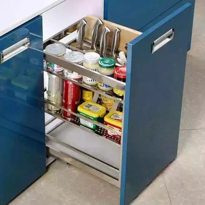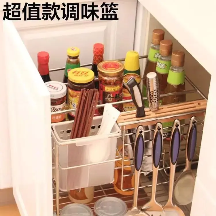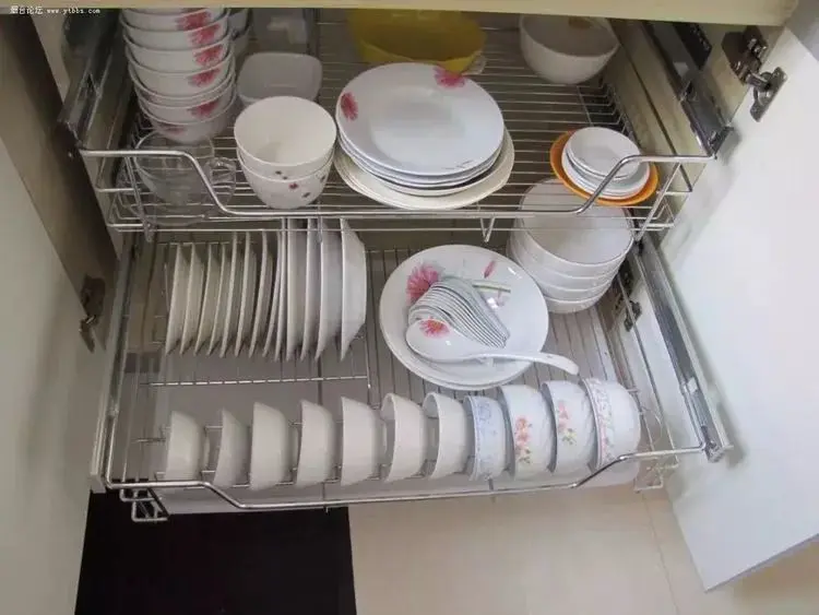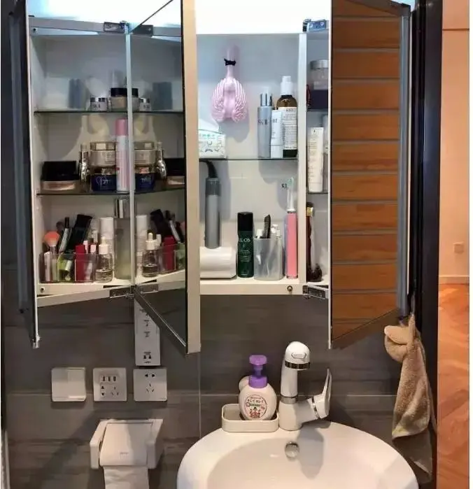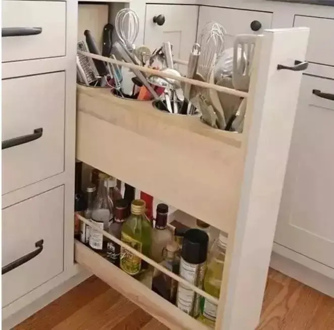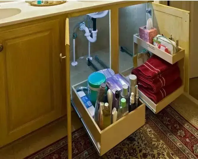 3、置物架:厨房、卫生间空间小东西多,如果收纳没做好,很多物品就会没有地方放,整个屋子看起来乱乱的,在厨房需要装拉篮,让调料、厨房用具整齐的存放在里面,卫生间需要浴室柜、浴室镜及置物架来收纳物品,这样东西多了也能放得下。
