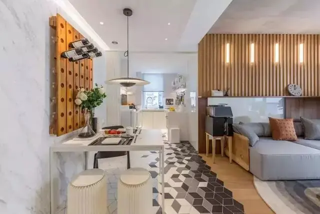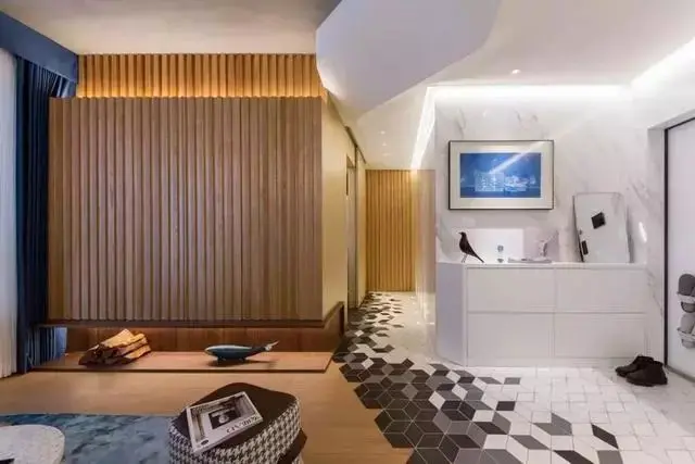 玄关处设置了一个矮柜,与大理石墙砖的搭配非常时尚大气。走廊和玄关的地面,采用黑白灰几何地砖渐变铺贴,层次感十足。