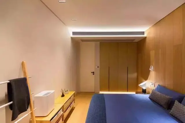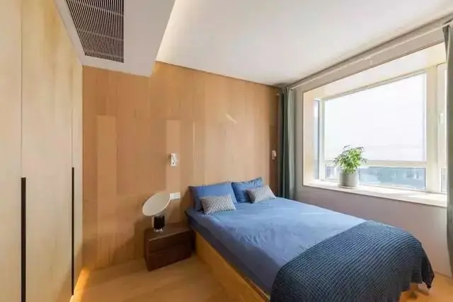 主卧也以原木色为主,搭配深蓝色床品和绿植的点缀,让睡眠环境更加清新雅致。
