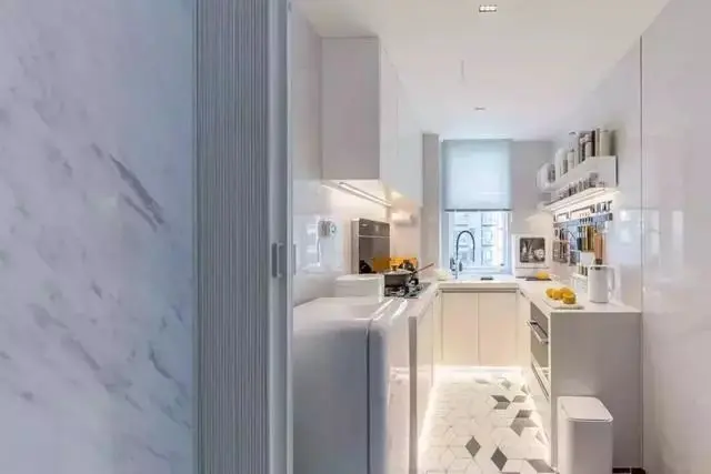 厨房采用折叠门的设计,非常节约空间。狭长型的小厨房选择了u型的布局,使用起来更加便捷。