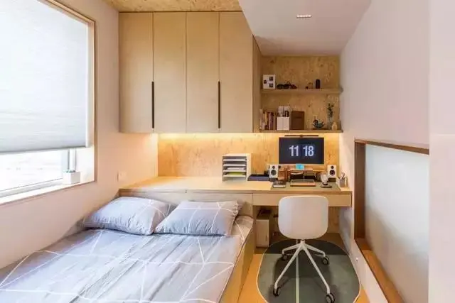 书房的空间比较小,榻榻米+收纳柜的设计刚好,吊柜底部安装灯带,满足了书桌对灯光的需求。