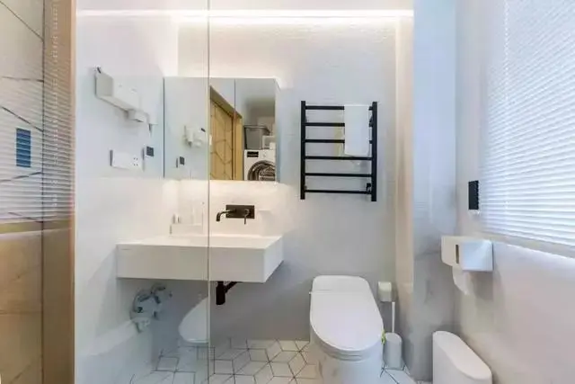卫生间通过玻璃隔断实现了干湿分离,洗衣机和烘干机也叠放在淋浴区,不仅节省空间,使用起来也很方便。