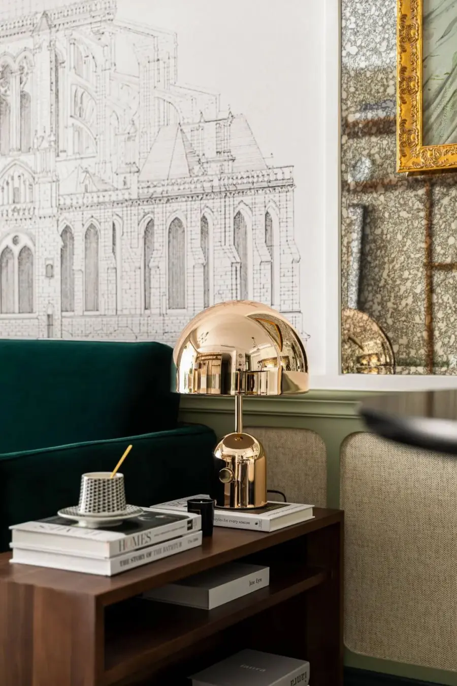 客餐厅一个空间一脉相承,胡桃木质感的定制展架与与灰豆绿的护墙融合,轻熟风的电影场景应运而生,墨绿色绒布沙发触感细腻柔软,呼应了空间主色调绿色,碰撞出复古混搭的格调。