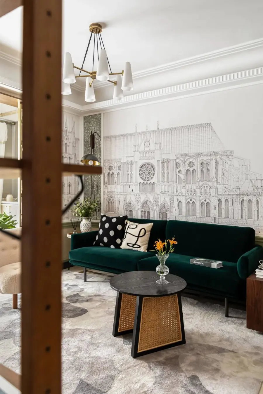 摒弃了原结构吊顶和样板化的墙面造型,加之围合半护墙、复古镜面、古堡壁画等元素进行融合,一个艺术铺陈的复古精致居所就此呈现……