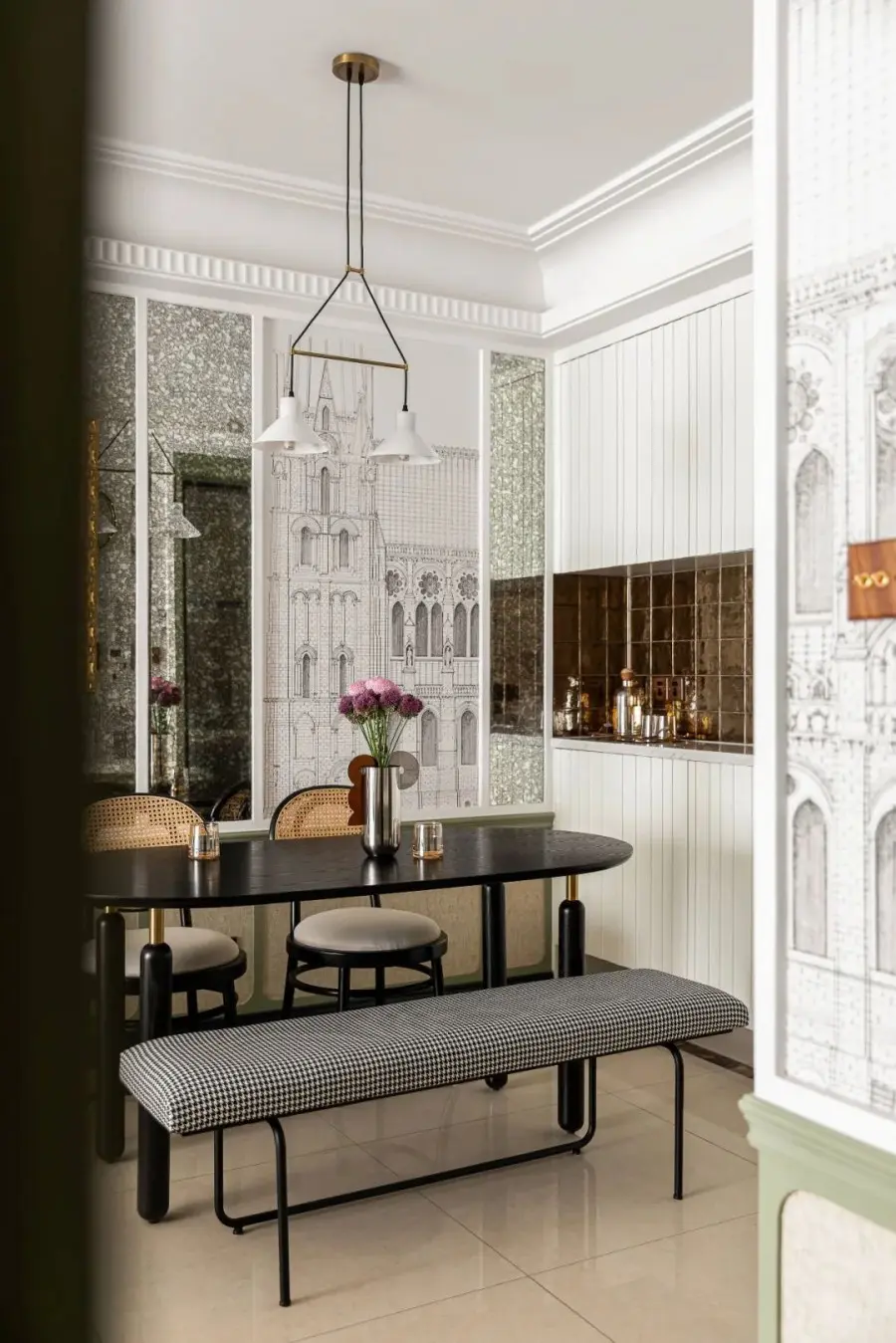 客餐厅贯通南北,舍弃阳台移门,用金属隔断代替,更好的引入自然光线。灰豆绿色墙裙融入米色草编壁纸,白色框线搭配壁纸和复古银镜的点缀,丰富了墙面的层次感,增添了空间的精致与休闲韵味。