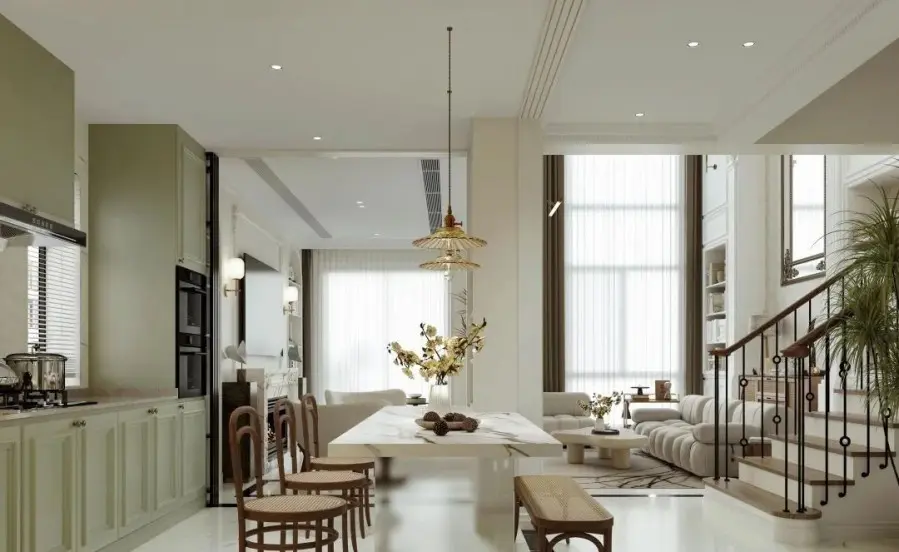 挑空客厅在温婉的米白色基底包围之下,融入清新的薄荷绿,给人治愈清新的视觉感受。白色的沙发与茶几相互衬托,巧妙的融进整体氛围,在柔和的灯光及背景下,自忖几许雍容与华贵。
