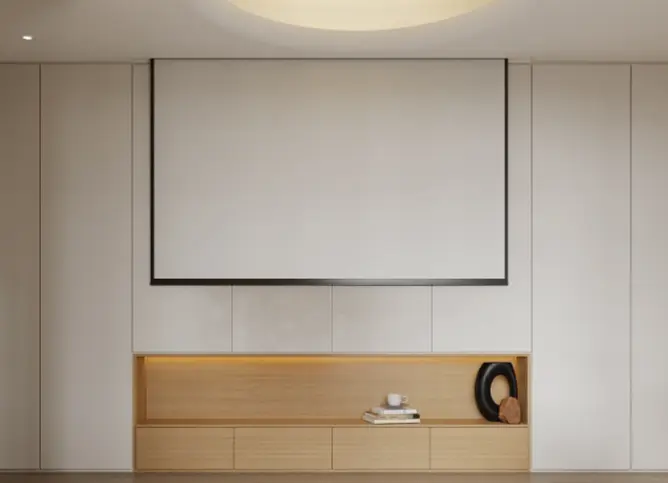 电视背景墙摒弃了传统的设计方式,选用了投影幕布来增加追剧的体验感。