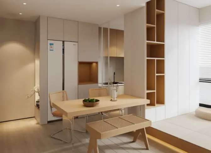 木饰面+米白色柜体的结合,以厨房延伸做餐边柜的的形式,在功能上给餐厅以更多的承担,透明亚克力悬浮桌腿的设计也让这个餐厅体量更融于整体空间协调。