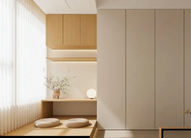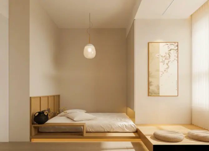 原始客厅一分为二,以日式的风格及精简设计做卧空间为立意点,满足风格的同时也最大程度保留了居住的自然光及客厅的自然光线,结合无主灯的悬浮顶设计,最大限度保留空间尺度感。