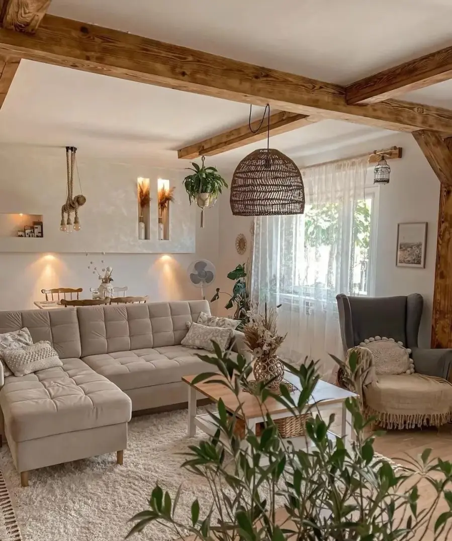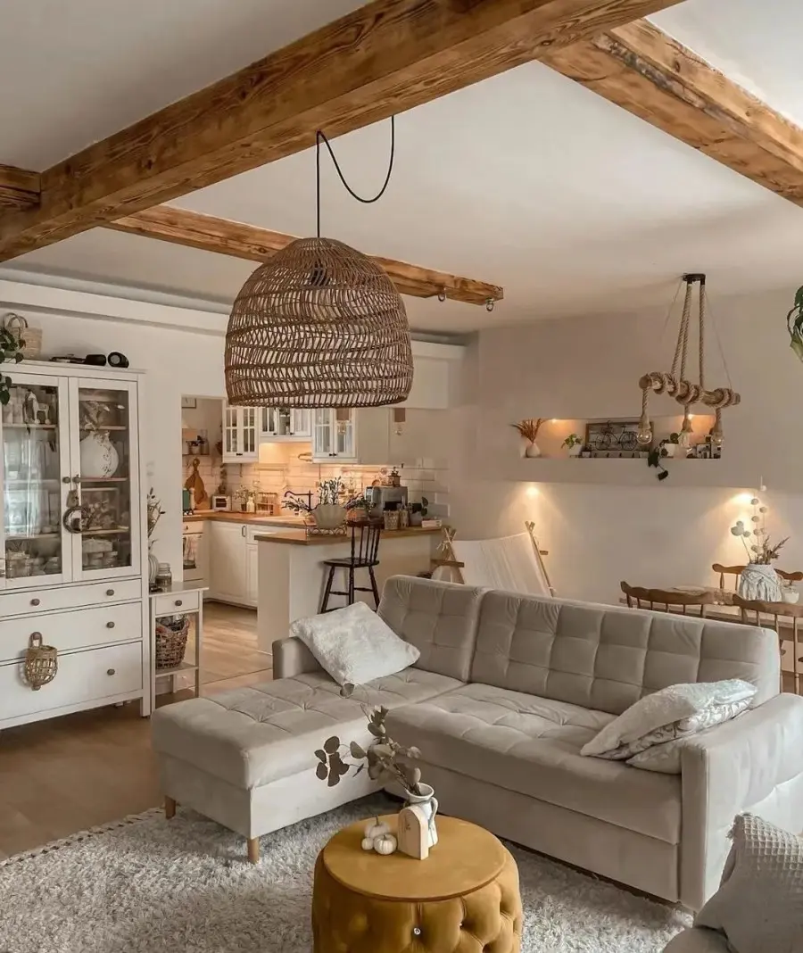 田园风格的装饰主要基于新鲜和自然的色彩。它的主要颜色通常是白色,粉红色,绿色和其他自然色。另外,在配套设施和装饰风格上,木质元素的使用也更多。餐桌和茶几等家具大多采用实木材料制成,然后与小花沙发和彩色地毯相配,进一步彰显了乡村的自然气息。