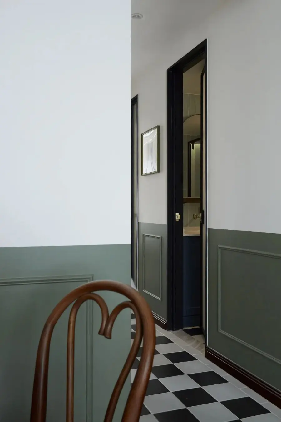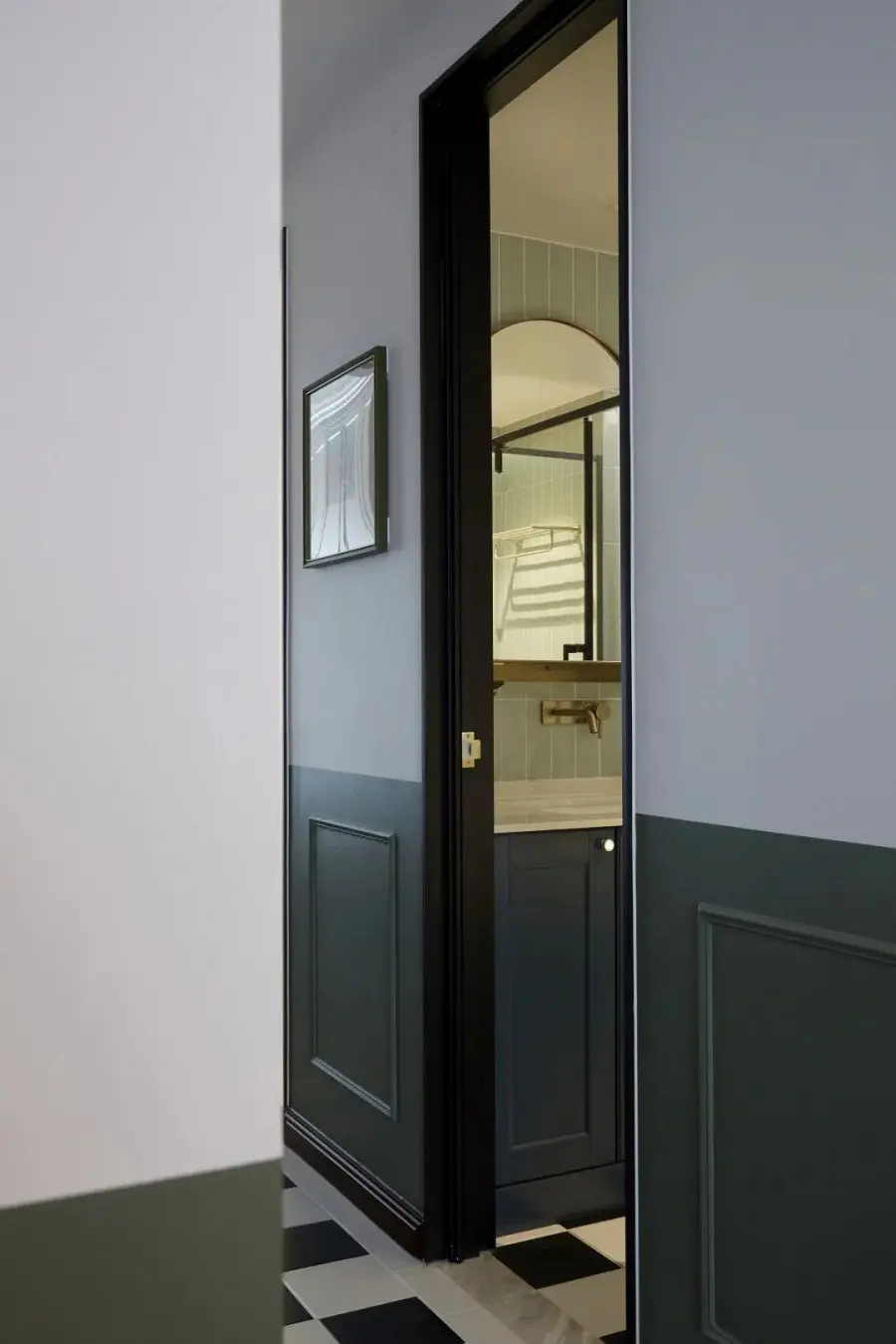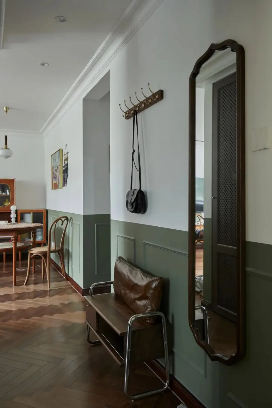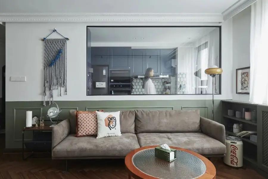 玄关过道很窄,几乎没有地方放置玄关柜,最后将厨房的长度缩短,用缩短空间的面积做个定制柜子,来满足日常出入收纳的需求。玄关、走廊和客餐厅三个连续的空间半墙都刷复古绿色,让视觉可以产生延伸感。