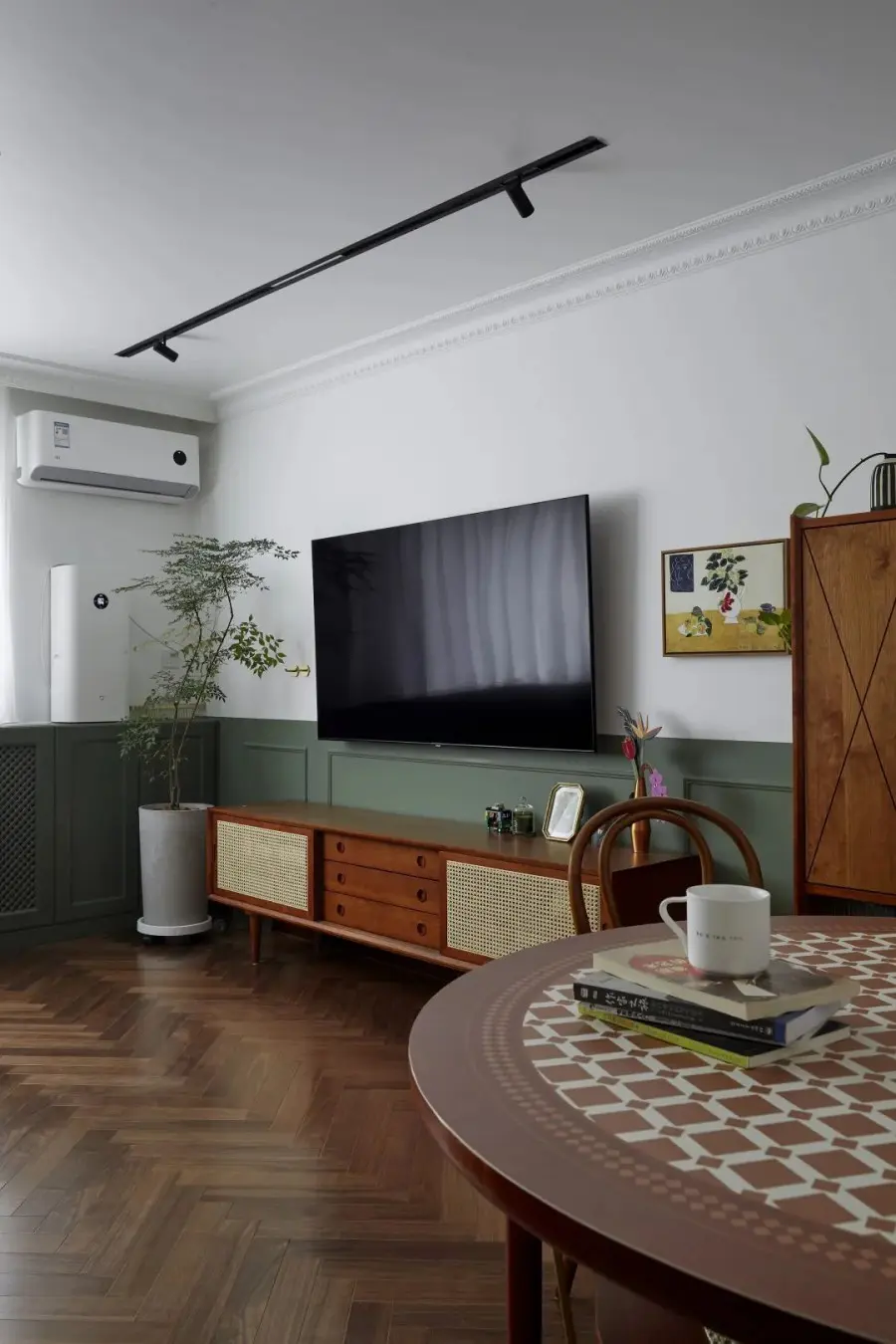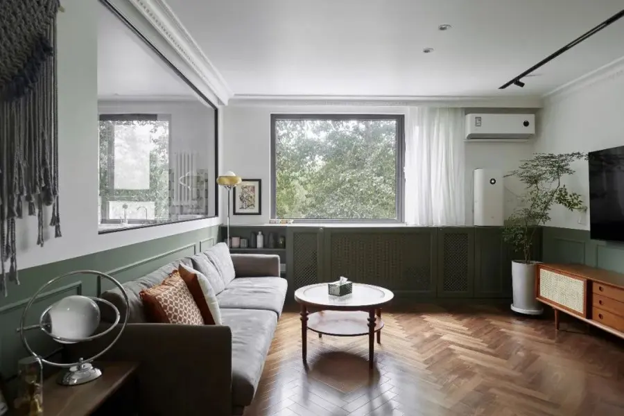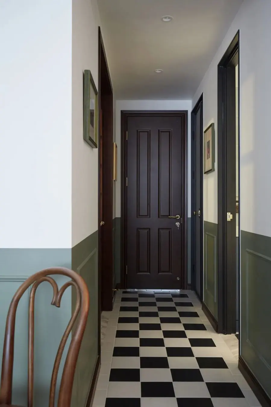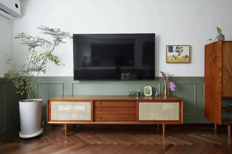 玄关过道很窄,几乎没有地方放置玄关柜,最后将厨房的长度缩短,用缩短空间的面积做个定制柜子,来满足日常出入收纳的需求。玄关、走廊和客餐厅三个连续的空间半墙都刷复古绿色,让视觉可以产生延伸感。
