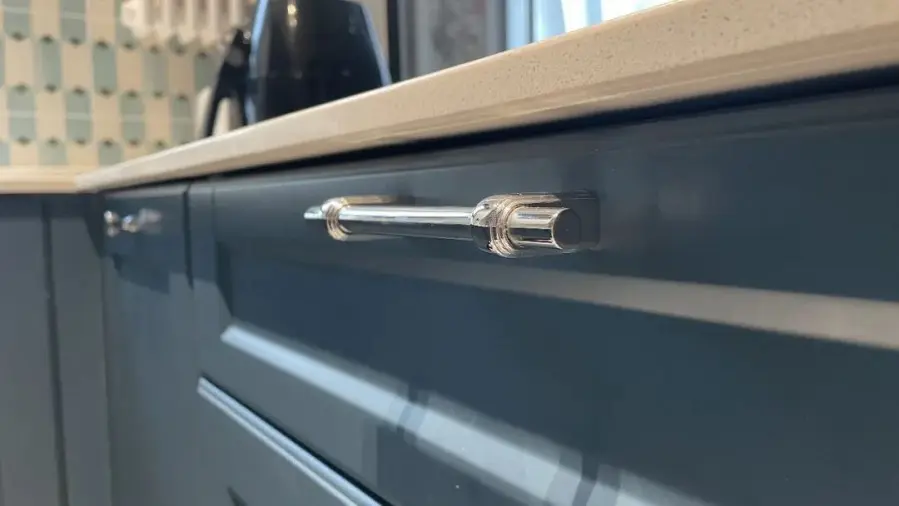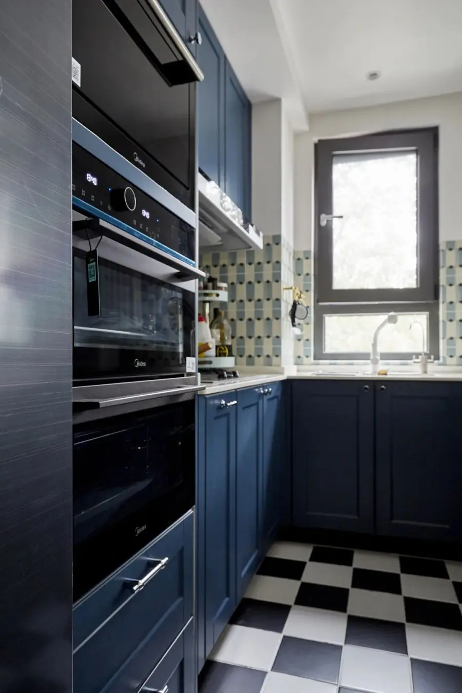 窗台下面打造定制柜,一来遮挡老旧的暖气管,沙发旁边的壁龛作茶几的补充收纳,延伸出的柜体可全部用来收纳,而且在无形之中加宽窗台台面,使平淡无奇的窗台变成一个小吧台。得天独厚的优势是客厅窗景,即使不出门,也能体会到外在环境的变化。厨房空间用透明玻璃墙取代实墙,创造出穿透度十足的流畅视线。壁面和地面的设计颇为用心,地面延用走廊的黑白方砖,让两个空间能彼此呼应。橱柜是哑光浅蓝色,市面上比较少见,需要特别定制。五金方面,所有的柜门把手都是用心挑选过的,造型轻巧,透亮的银质,呈现出精致感。客厅和走廊的地砖很特别,采用黑白方砖拼贴而成,强调怀旧复古的氛围,这种拼法也塑造出一种无边无际的视觉效果,让空间具有延伸放大感。