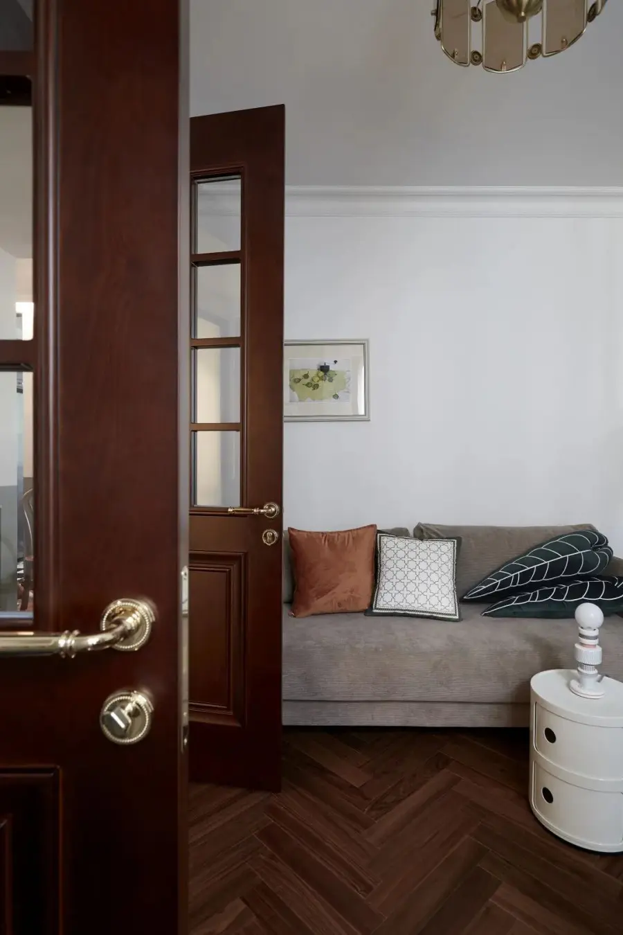 墙面和天花勾勒简约的石膏线造型,搭配人字拼胡桃木色木地板,把法式风情体现得淋漓尽致。
