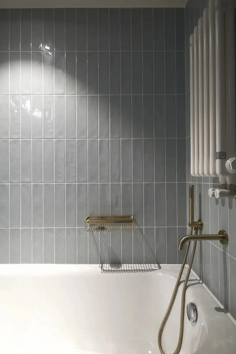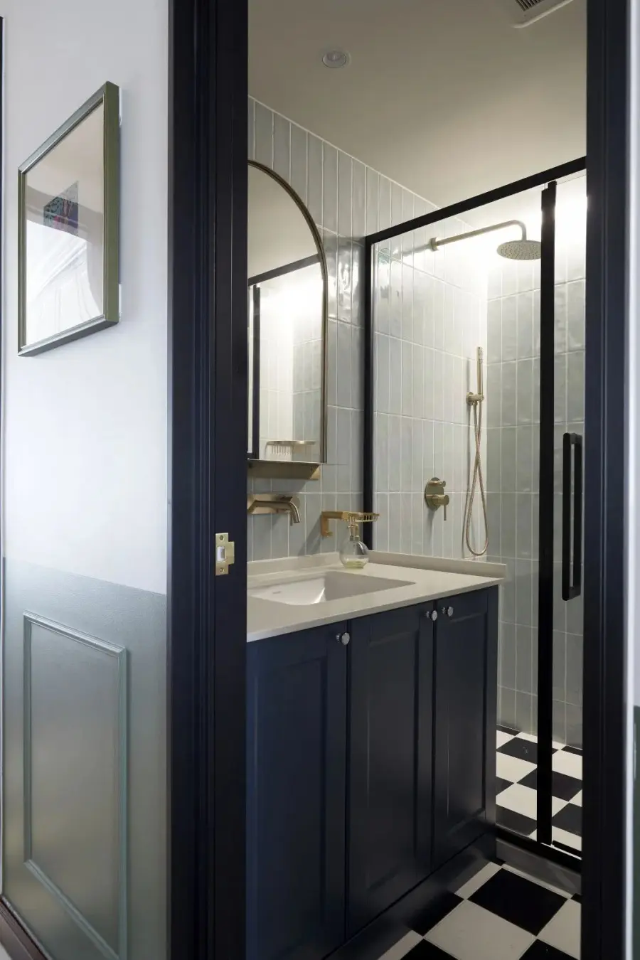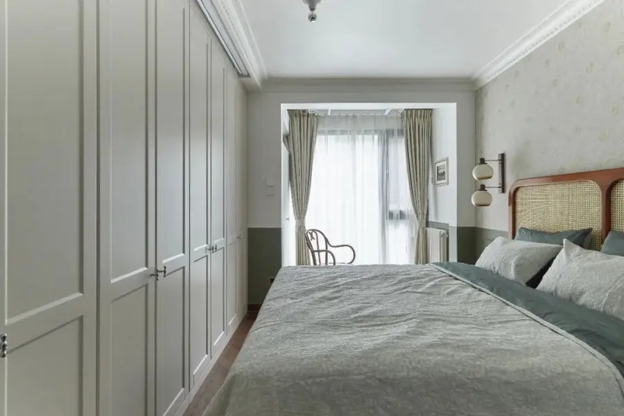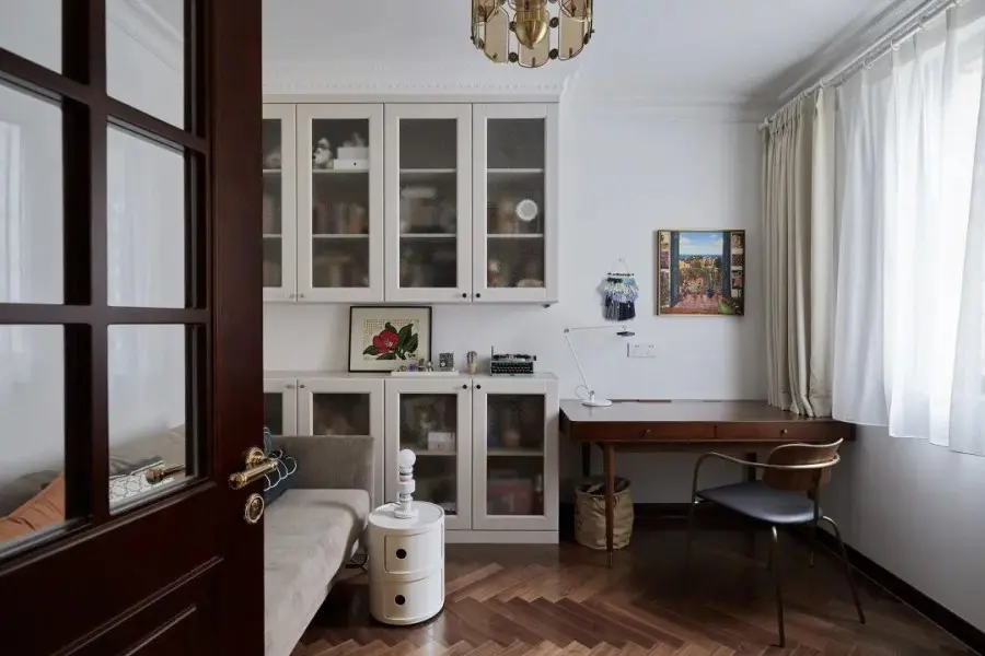 书房采用双开门营造出大器的空间感,深木纹色和金属把手搭配在一起,以层层细节上的美学营造独有复古风。书房靠墙一侧是成品书桌和定制的书柜,柜体安装后封顶贴石膏线,不留分毫卫生死角,同时渲染一片优雅宁静。关于主卧的规划,风格上与公共区域保持一致,半墙粉刷绿色乳胶漆,有效缓和了阳台梁柱的压迫。在整体面积没有改变的情况下实现干湿分离。湿区分为洗手区和两个淋浴区,墙面全部用浅青色釉面砖,让卫生间配色不显压迫。浴室柜对面设计了浴缸,让屋主有一个泡澡放松之处。壁挂马桶后方是一面磁吸墙,所有铁件物品都可以吸附在墙上,完全不占台面空间。