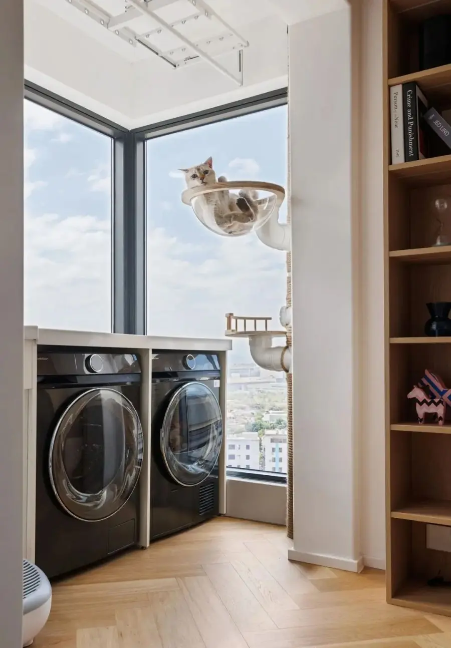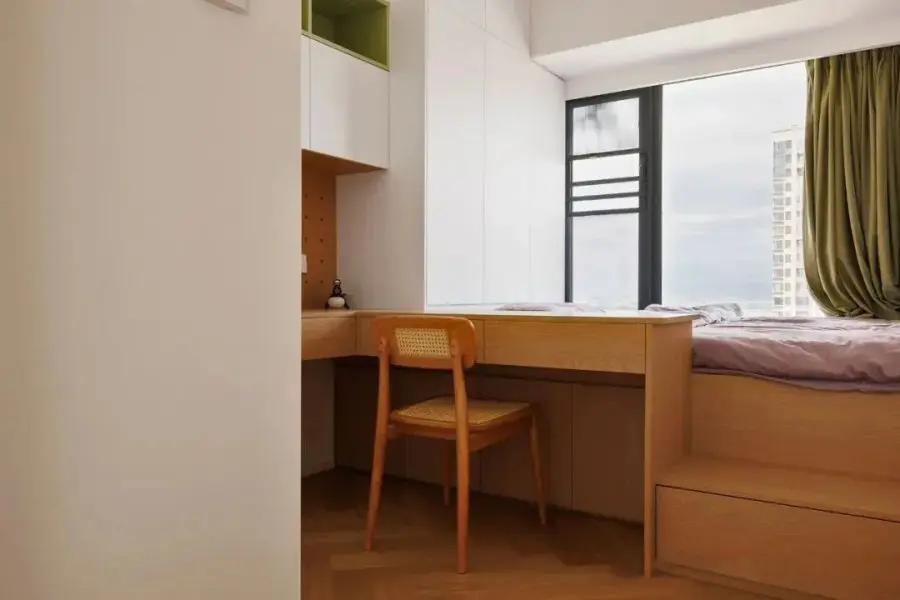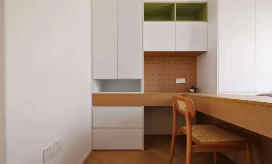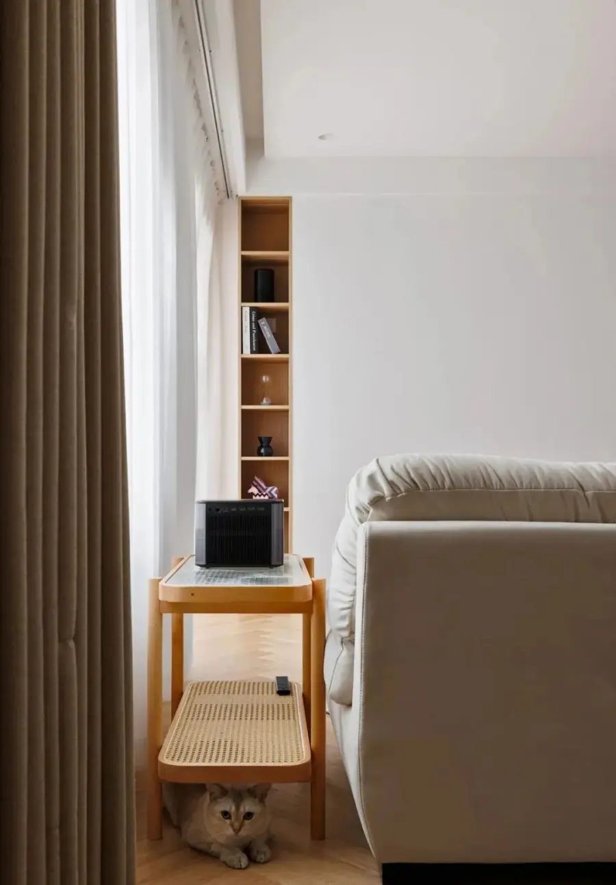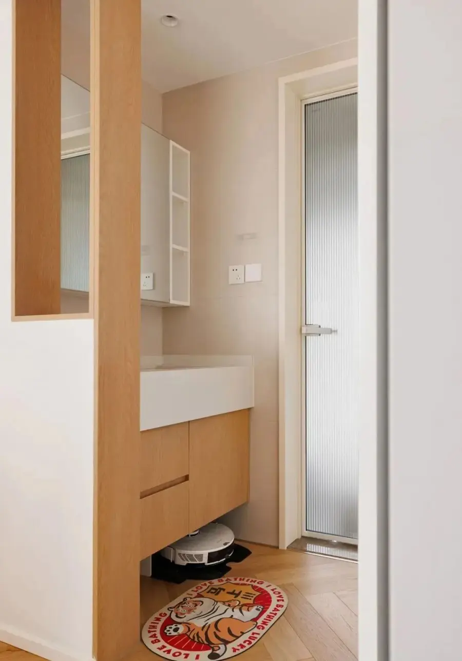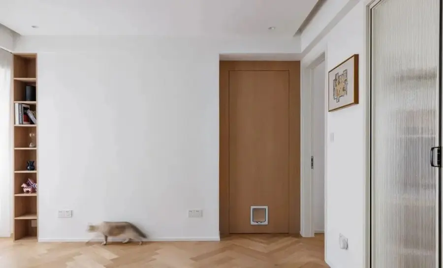 ▲ 厨房U型布局,白色的橱柜搭配小白砖墙面与花砖地面,简练美观好打理▲ 厨房望向客厅,拆除原地砖后通铺人字拼木地板,整个空间以白色与木色为主,简单且温柔▲ 客厅,慵懒舒适的沙发可坐可躺,取消茶几腾出更宽敞的活动区▲ 取消电视用投影取代,大白墙可直接充当投影幕布,左侧增设一列开放格做置物装饰▲ 主卧入口设计木饰面隐形门,下方还专门给家里的猫主子留了一个通道▲ 客厅外是生活阳台,利用水管设计猫爬架,趣味性十足,顶部安装了智能升降晾衣架▲ 书房将门洞扩大,采用折叠长虹玻璃隔断,更加灵活通透▲ 定制双人位书桌,中间还藏着一张小茶桌,满足业主看书喝茶的需求▲ 公卫干湿分离,浴室柜下方预留了扫地机器人充电位▲ 未来的儿童房,利用飘窗打造榻榻米集收纳柜一体,边上增设书桌,还能防止孩子摔下床▲ 书桌旁设计洞洞板背景,既能提升墙面装饰性,又能收纳一些小物件▲ 主卧延续整屋基调,棕色背景结合白色护墙板,一侧用梳妆台取代床头柜,方便女主人日常使用▲ 主卧拥有两组大衣柜,床尾的衣柜是借用部分客厅空间增加出来的