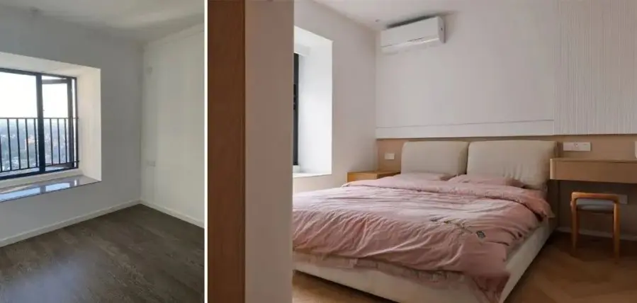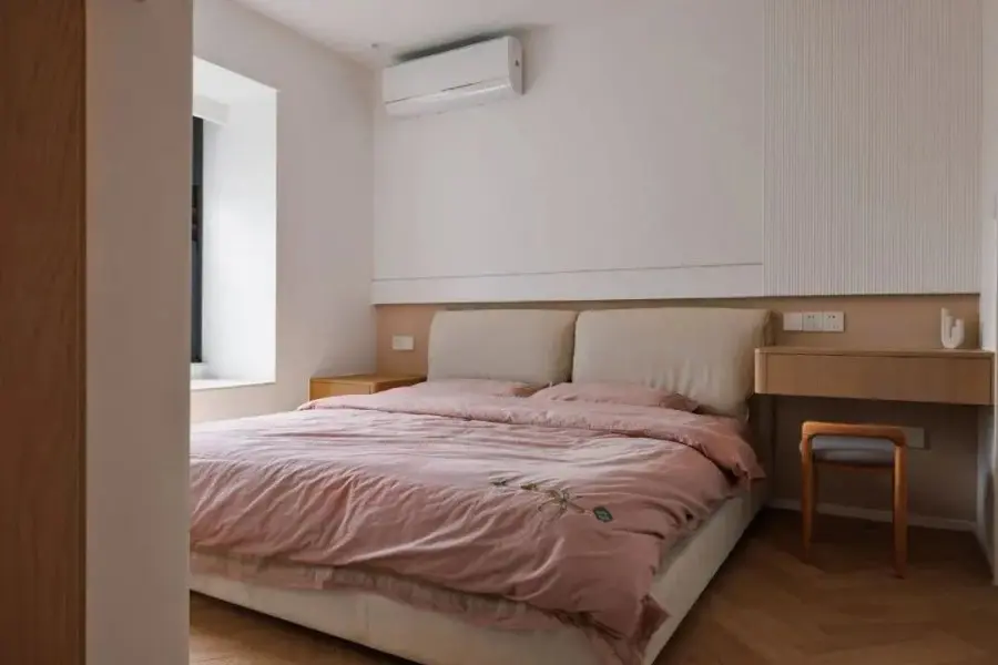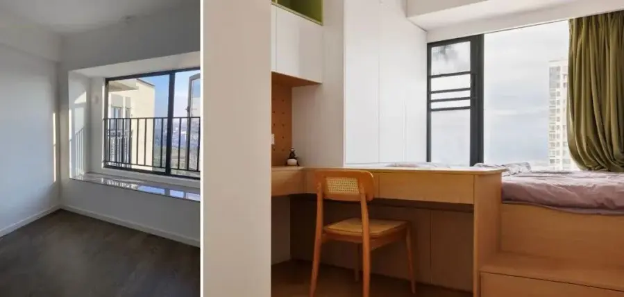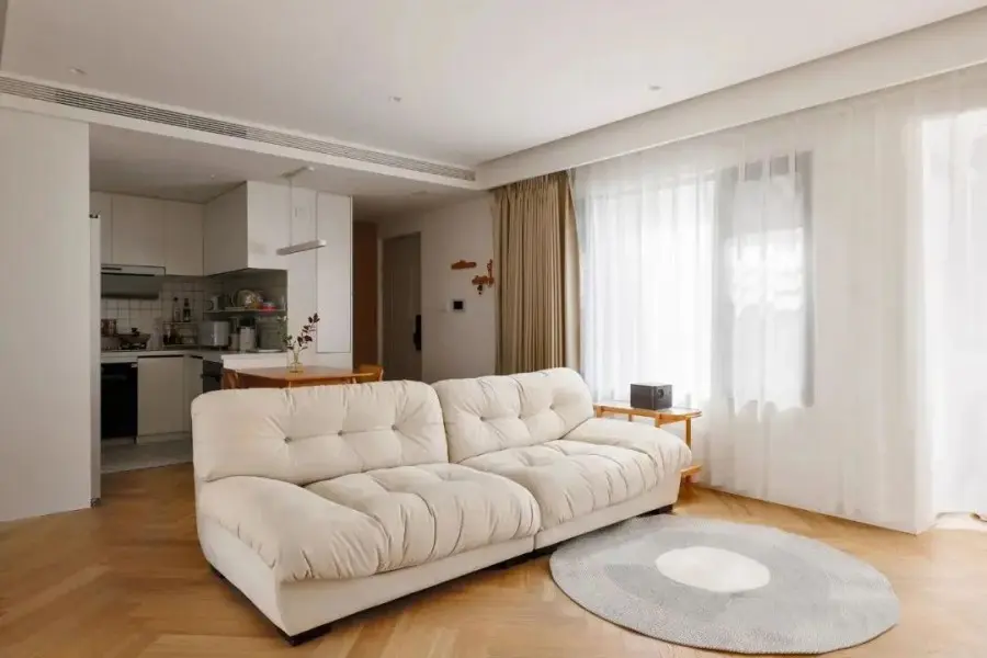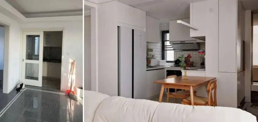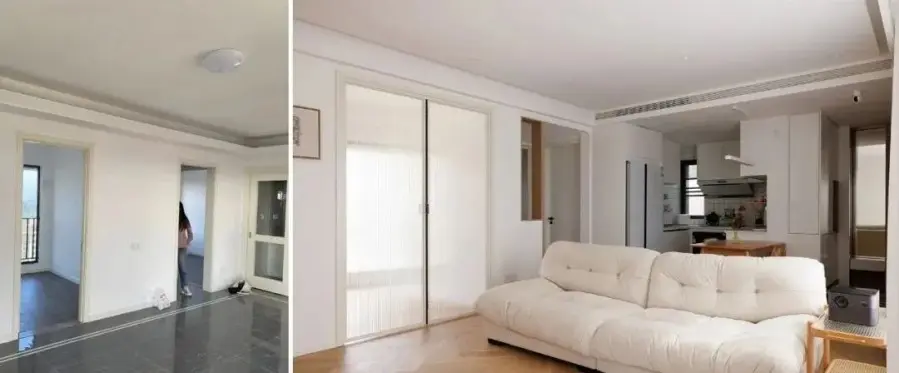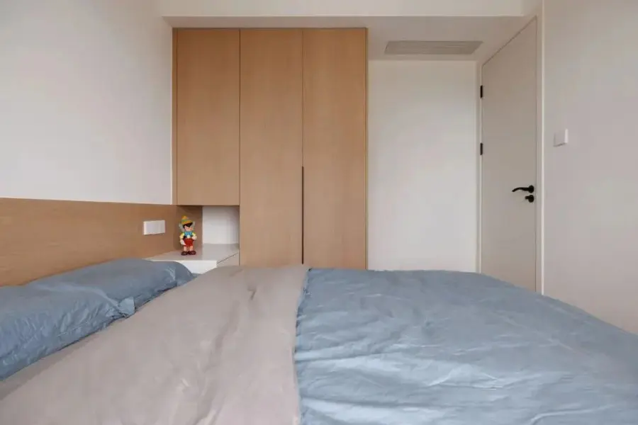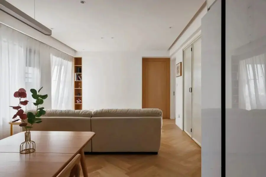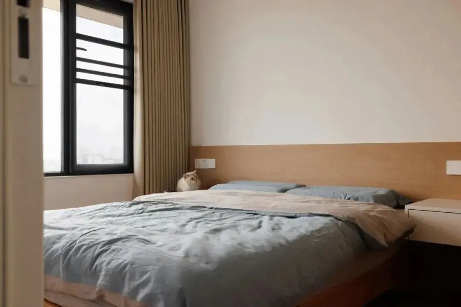 ▲ 厨房U型布局,白色的橱柜搭配小白砖墙面与花砖地面,简练美观好打理▲ 厨房望向客厅,拆除原地砖后通铺人字拼木地板,整个空间以白色与木色为主,简单且温柔▲ 客厅,慵懒舒适的沙发可坐可躺,取消茶几腾出更宽敞的活动区▲ 取消电视用投影取代,大白墙可直接充当投影幕布,左侧增设一列开放格做置物装饰▲ 主卧入口设计木饰面隐形门,下方还专门给家里的猫主子留了一个通道▲ 客厅外是生活阳台,利用水管设计猫爬架,趣味性十足,顶部安装了智能升降晾衣架▲ 书房将门洞扩大,采用折叠长虹玻璃隔断,更加灵活通透▲ 定制双人位书桌,中间还藏着一张小茶桌,满足业主看书喝茶的需求▲ 公卫干湿分离,浴室柜下方预留了扫地机器人充电位▲ 未来的儿童房,利用飘窗打造榻榻米集收纳柜一体,边上增设书桌,还能防止孩子摔下床▲ 书桌旁设计洞洞板背景,既能提升墙面装饰性,又能收纳一些小物件▲ 主卧延续整屋基调,棕色背景结合白色护墙板,一侧用梳妆台取代床头柜,方便女主人日常使用▲ 主卧拥有两组大衣柜,床尾的衣柜是借用部分客厅空间增加出来的