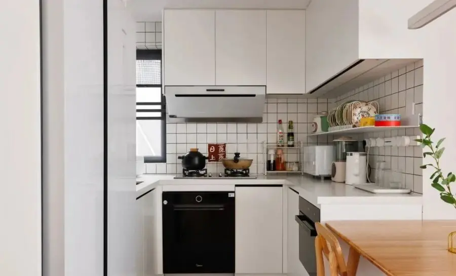 ▲ 厨房做开放式处理,选择可伸缩餐桌满足日常就餐需求,也能作为厨房操作台的补充,鞋柜的上半部分从侧面打开,用来存放零食