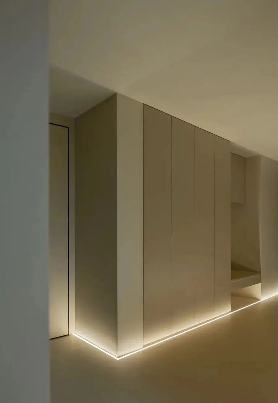 入户右手边靠墙打造与墙面平齐的收纳柜体,纯色按压式无把手柜面,低调内敛,无边条设计更显简约,近门处设计换鞋区,上方空间同样利用起来,入户空间收纳隐形,同时满足收纳需求。底部从入户至转角安装线性灯带,感应灯随脚步而亮,解决入户后照明缺失,避免摸黑寻找开关。