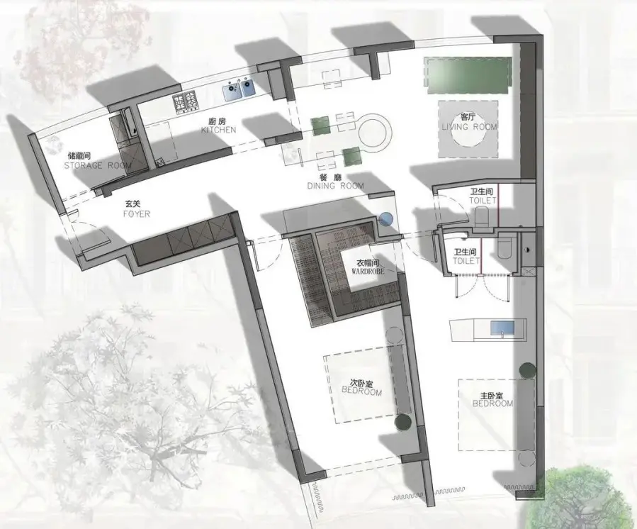 于进门处让渡空间给主卧打造独立衣帽间,主卧套间功能更为齐全。将原主卫打开,干区结合梳妆台打造,独立居中,马桶区与淋浴区各自独立,三分离式使用更为便捷卫生。同时于主卧中形成洄游动线,卧室公共区域视野更开阔通透。