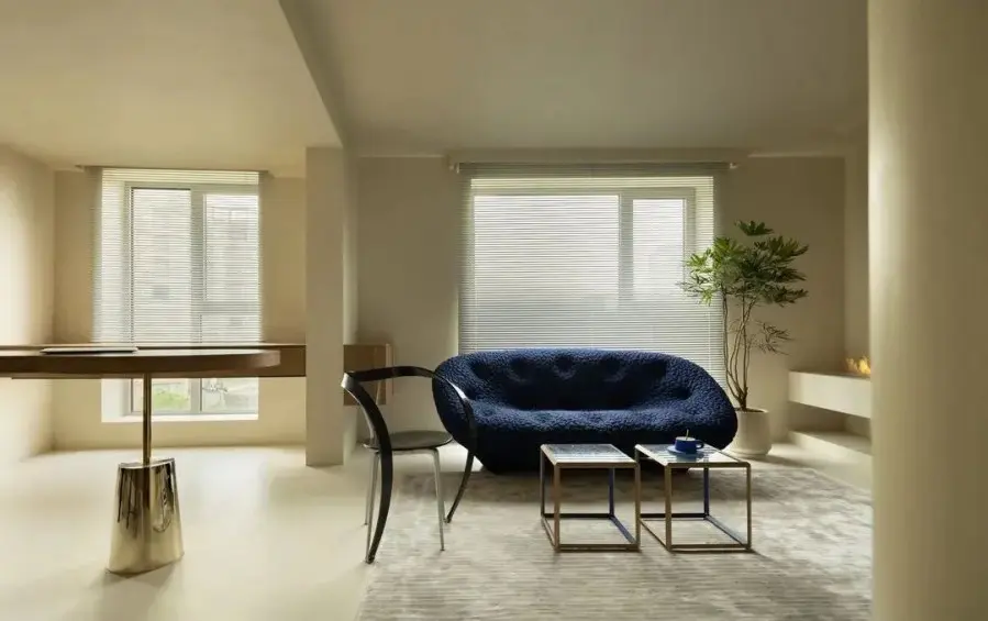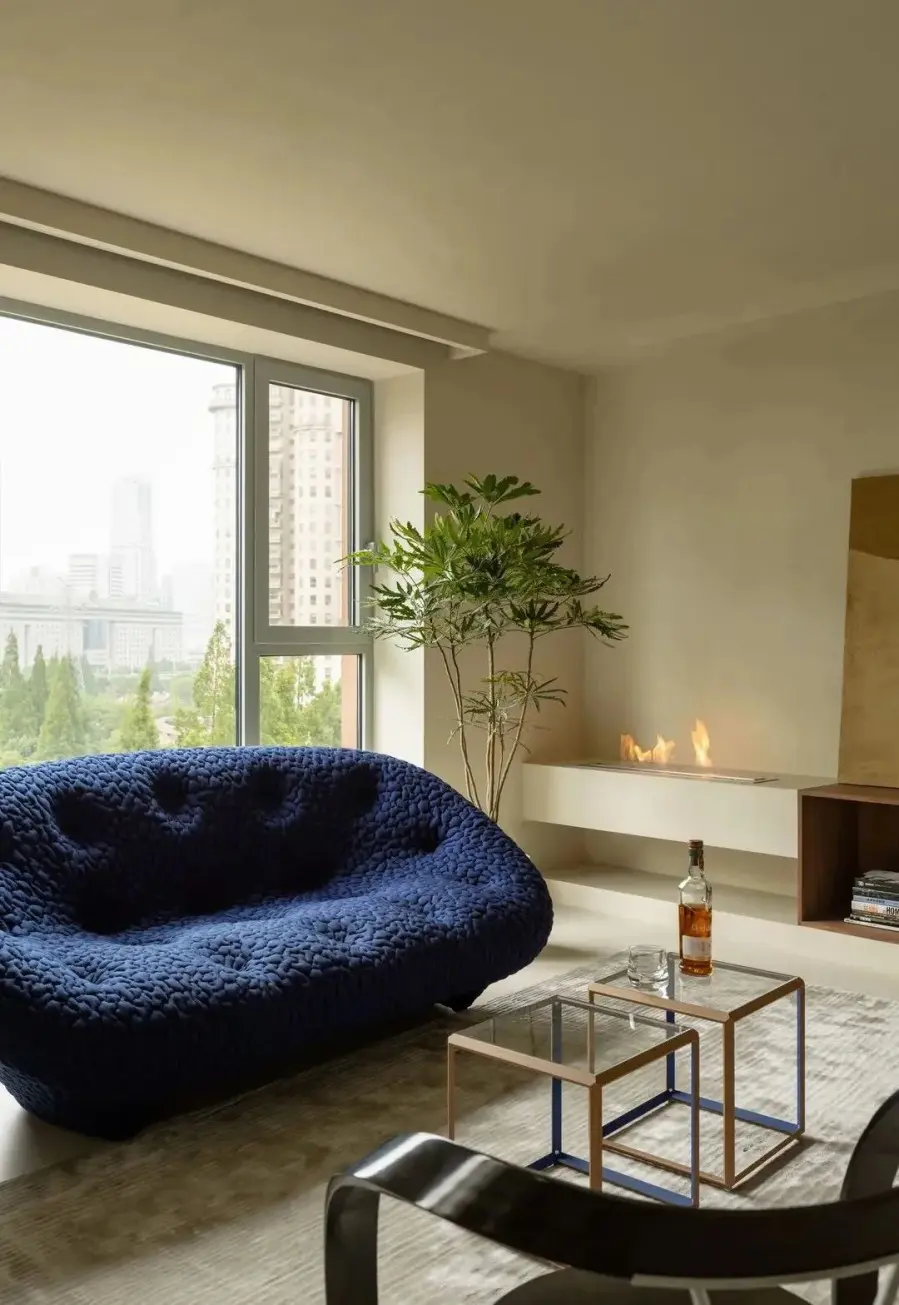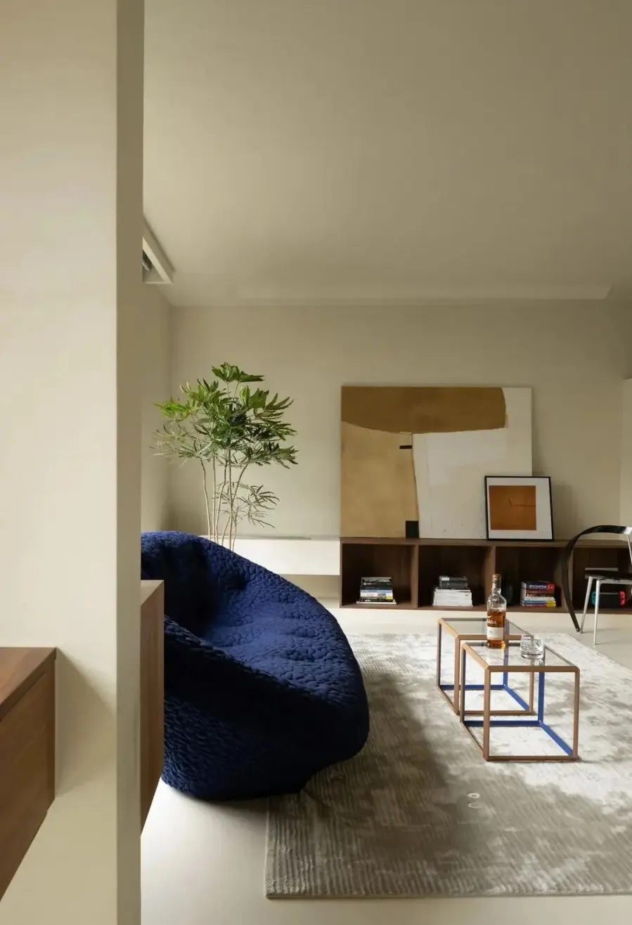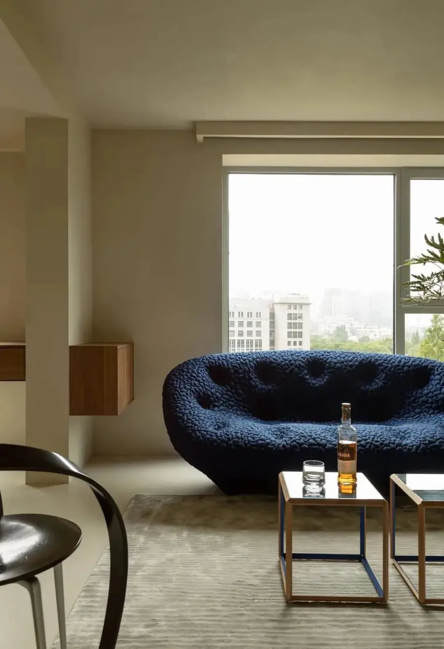 贝壳沙发,造型轻盈独特,搭配金属边框透明小几,利用视觉轻盈的软装契合低调内敛的纯粹空间底色,构筑温和无负担的空间,视觉上释放压力,也带给屋主更为舒适的放松与享受。