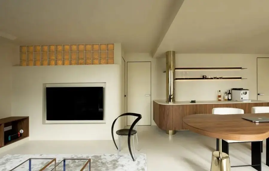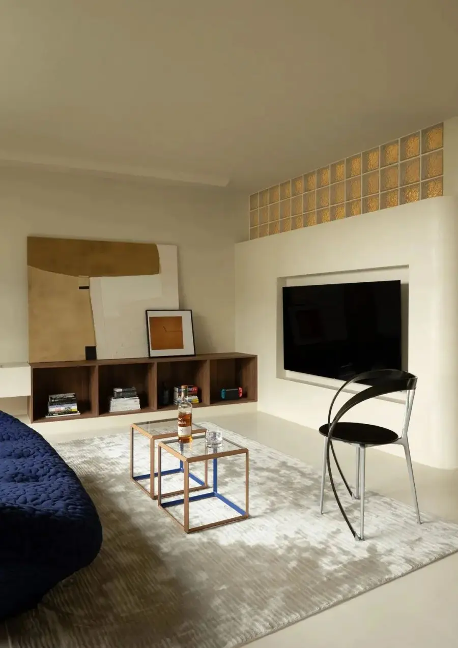 电视墙背靠次卫,墙体上方嵌入玻璃砖墙,引光过渡,将两个空间以光线联系起来,视觉上更显亲密,空间的通透感得以释放。背景墙以极简无修饰的纯粹造型展示,预留出契合电视机的尺寸,将杂乱的电线和各色管道藏于背后,连通机体一同掩藏在背景墙内,视觉上柔和而具有包裹感。