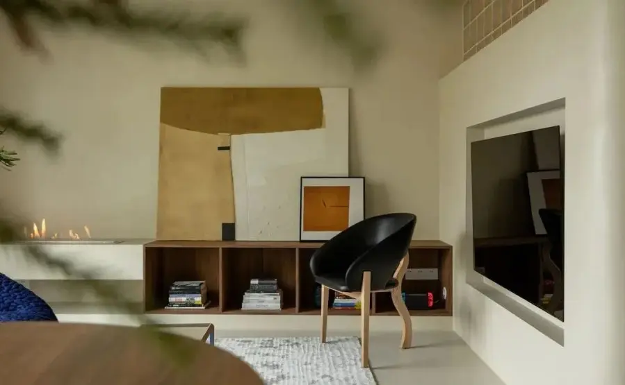 水泥现浇真火壁炉,悬浮造型轻盈别致,丰富墙面造型设计,提升生活情调,下方地台铺就的一方空间,同样可用作客厅内常用杂物的收纳,设计巧妙而美观。