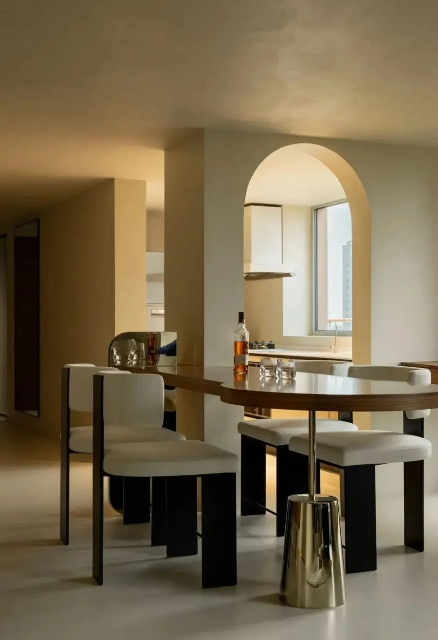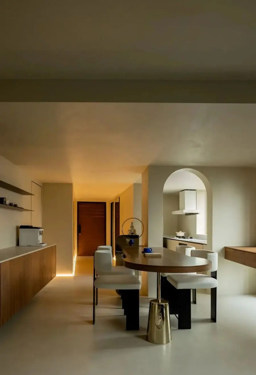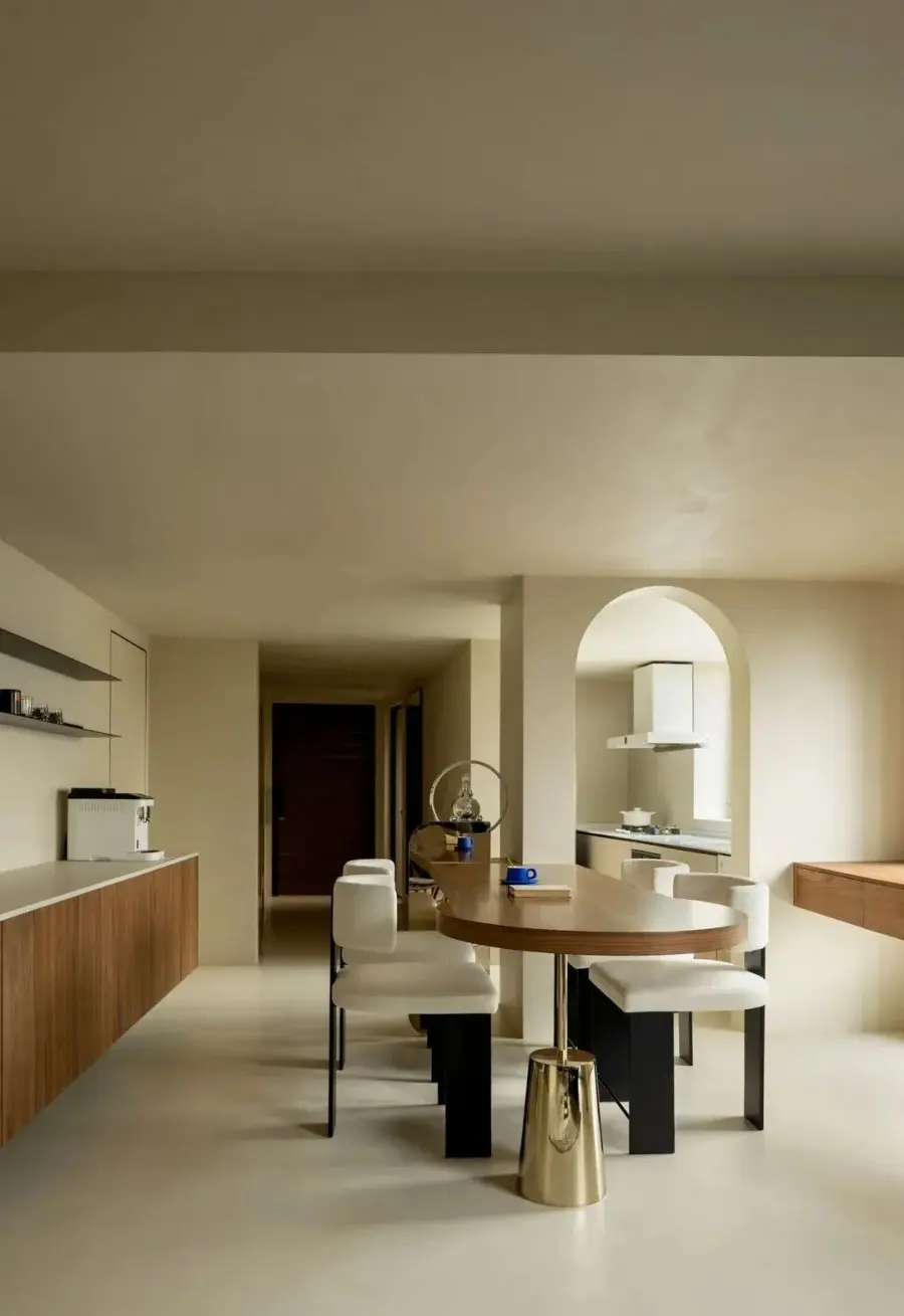 餐厅侧面靠墙打造餐边柜,作为西厨区使用,中西厨分离使用,西厨位于公共区域中部,距离客餐厨都不远,更符合其功能性,使用上更为便利,墙上定制超薄金属搁板,既能置物也不影响走廊视觉美感。转角以圆润弧形柜体过渡,与餐桌曲线形成呼应,空间质感更为柔和。
