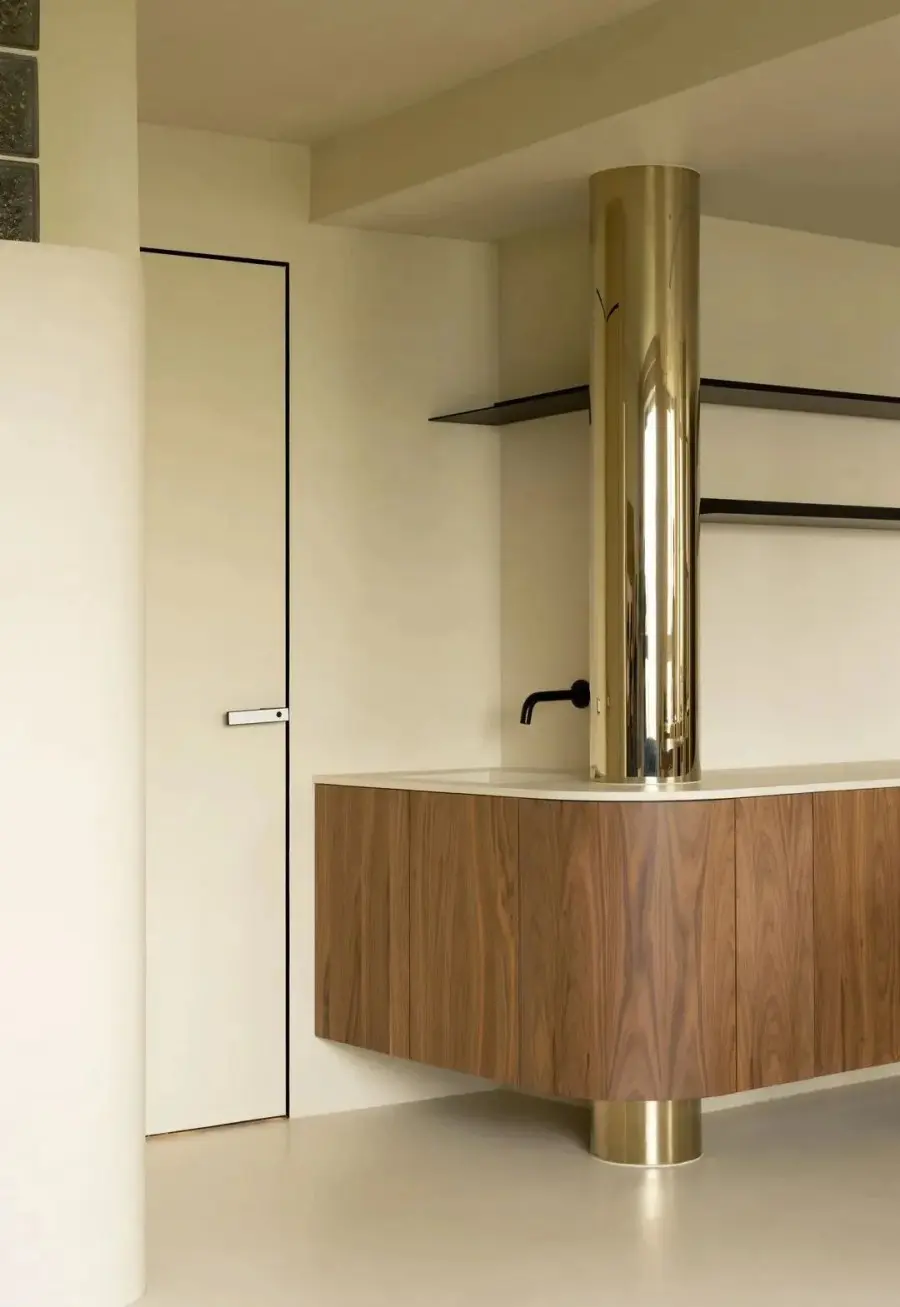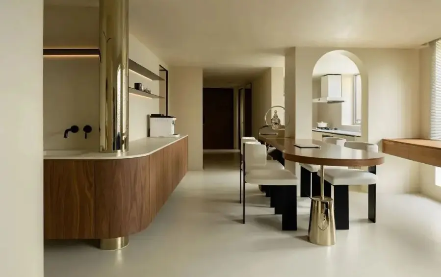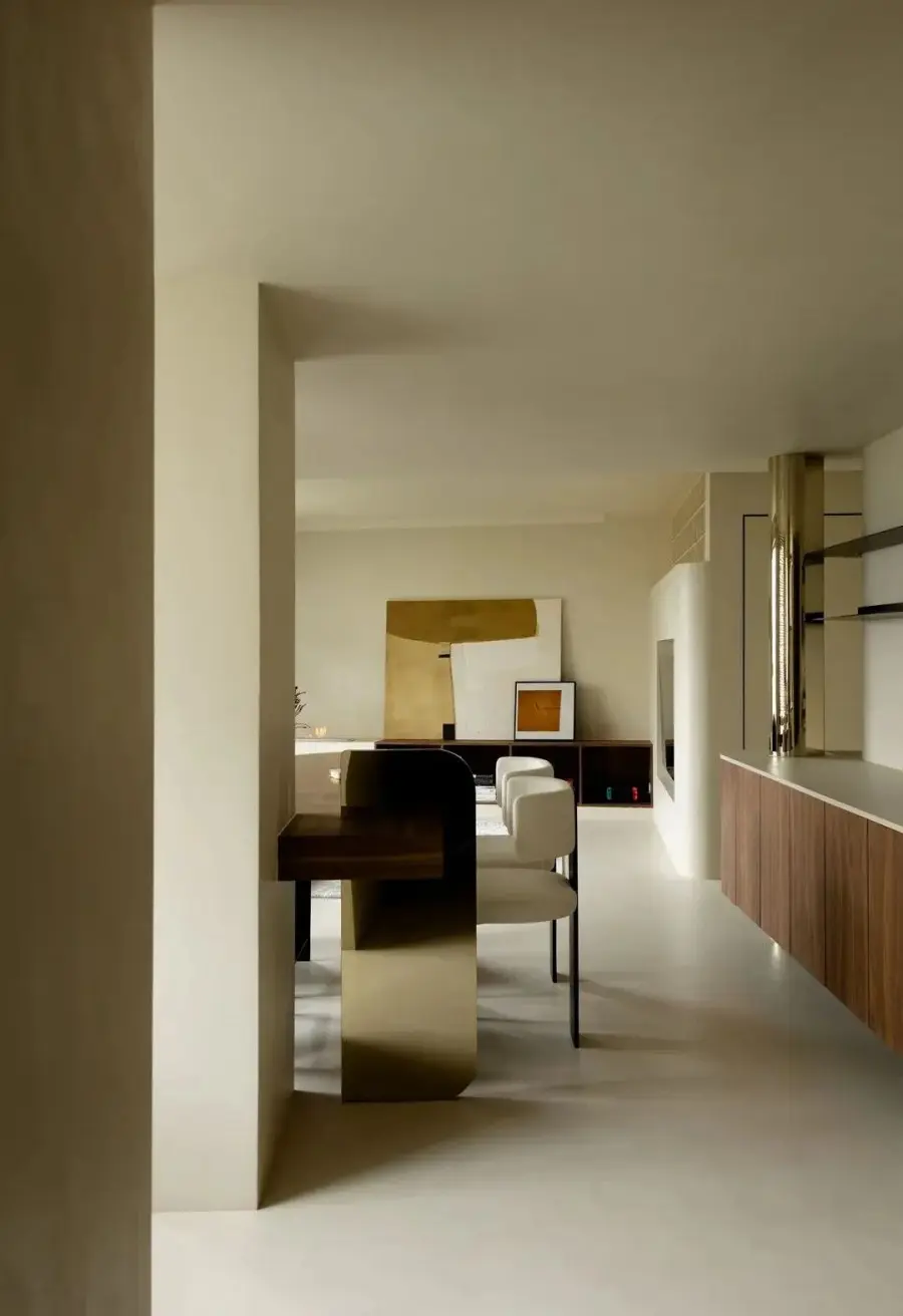 餐厅侧面靠墙打造餐边柜,作为西厨区使用,中西厨分离使用,西厨位于公共区域中部,距离客餐厨都不远,更符合其功能性,使用上更为便利,墙上定制超薄金属搁板,既能置物也不影响走廊视觉美感。转角以圆润弧形柜体过渡,与餐桌曲线形成呼应,空间质感更为柔和。