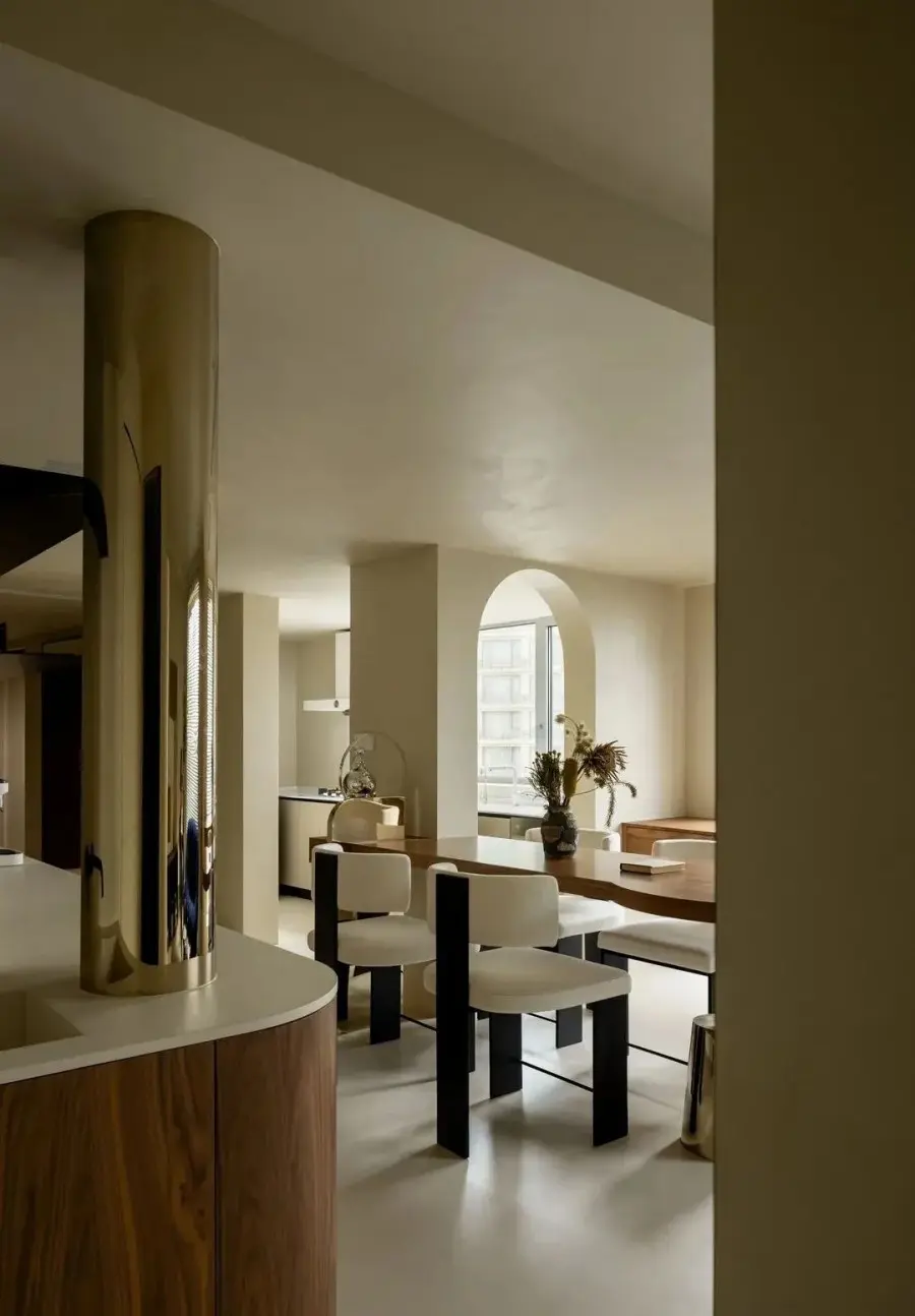 空间打开后,入户视野更为开阔,一眼贯穿整个户型,采光透过窗户入内,走廊也更为明亮。拱形门洞的设计,实现移步换景的视觉效果,丰富空间层次及纵深感,随着脚步走动,领略一步一景的奇妙美感。