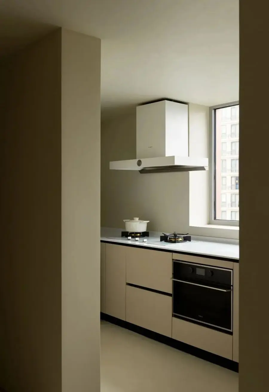 厨房从原来的单线进出变成双出口,动线更为灵活,与餐厅之间的交互性更为强烈。定制橱柜选用与墙地顶相近的色调,保持视觉上的统一,空间更显干净纯粹。